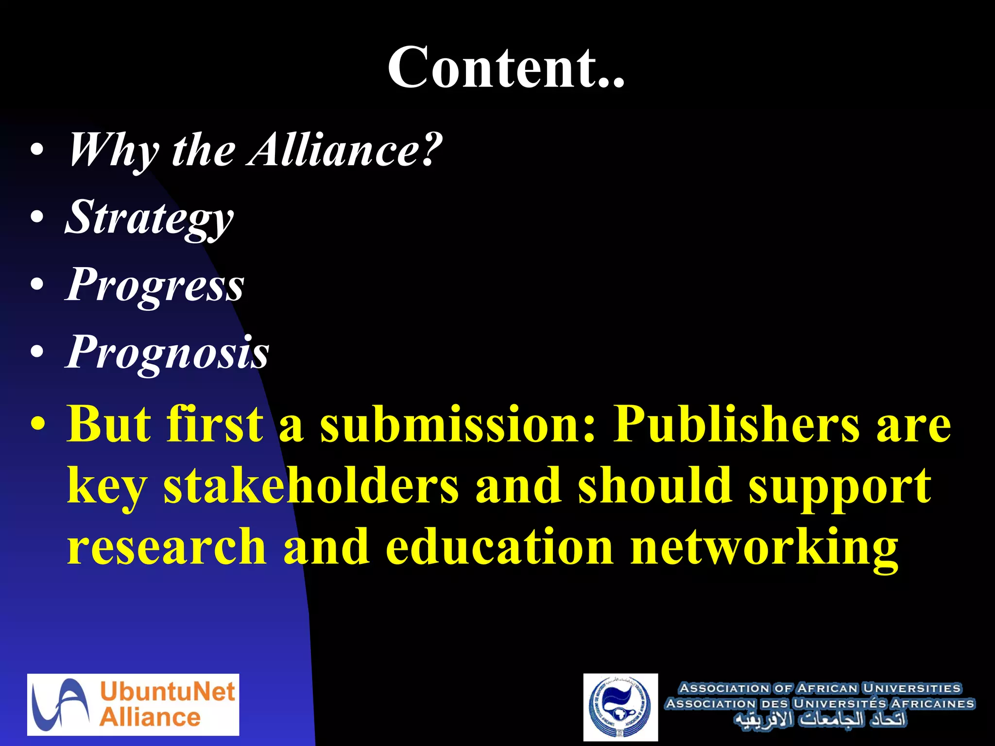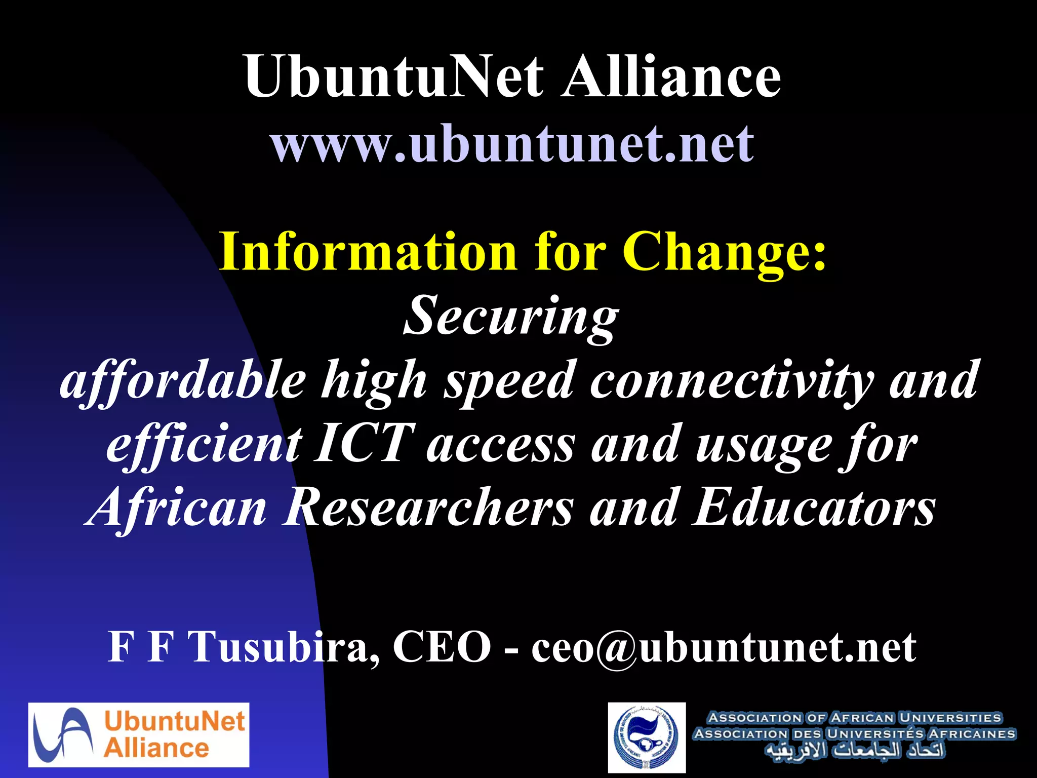 The UbuntuNet Alliance aims to enhance affordable high-speed connectivity for African researchers and educators to facilitate intellectual property generation and strengthen collaboration within the global research and education community. Key strategies include developing national research and education networks (NRENs) across Africa, securing sufficient bandwidth, and fostering interconnections. Progress includes advancements in member NRENs and significant reductions in connectivity costs over the past five years.
