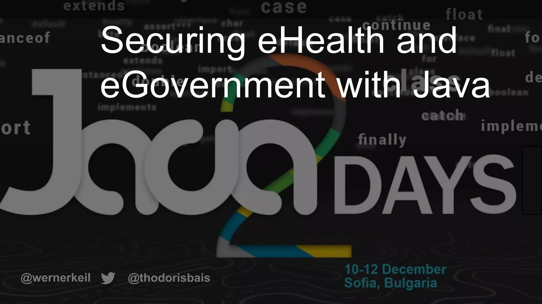 The document discusses securing eHealth and eGovernment systems with electronic signatures in Java. It covers topics like eHealth and eGovernment use cases in Germany and the Netherlands, requirements for secure transmission, electronic signature types and certificates, the Digital Signature Services (DSS) framework, and PDF security issues. The presentation aims to demonstrate how to create and validate digital signatures using Java libraries to enable secure eHealth and eGovernment applications and document exchange.