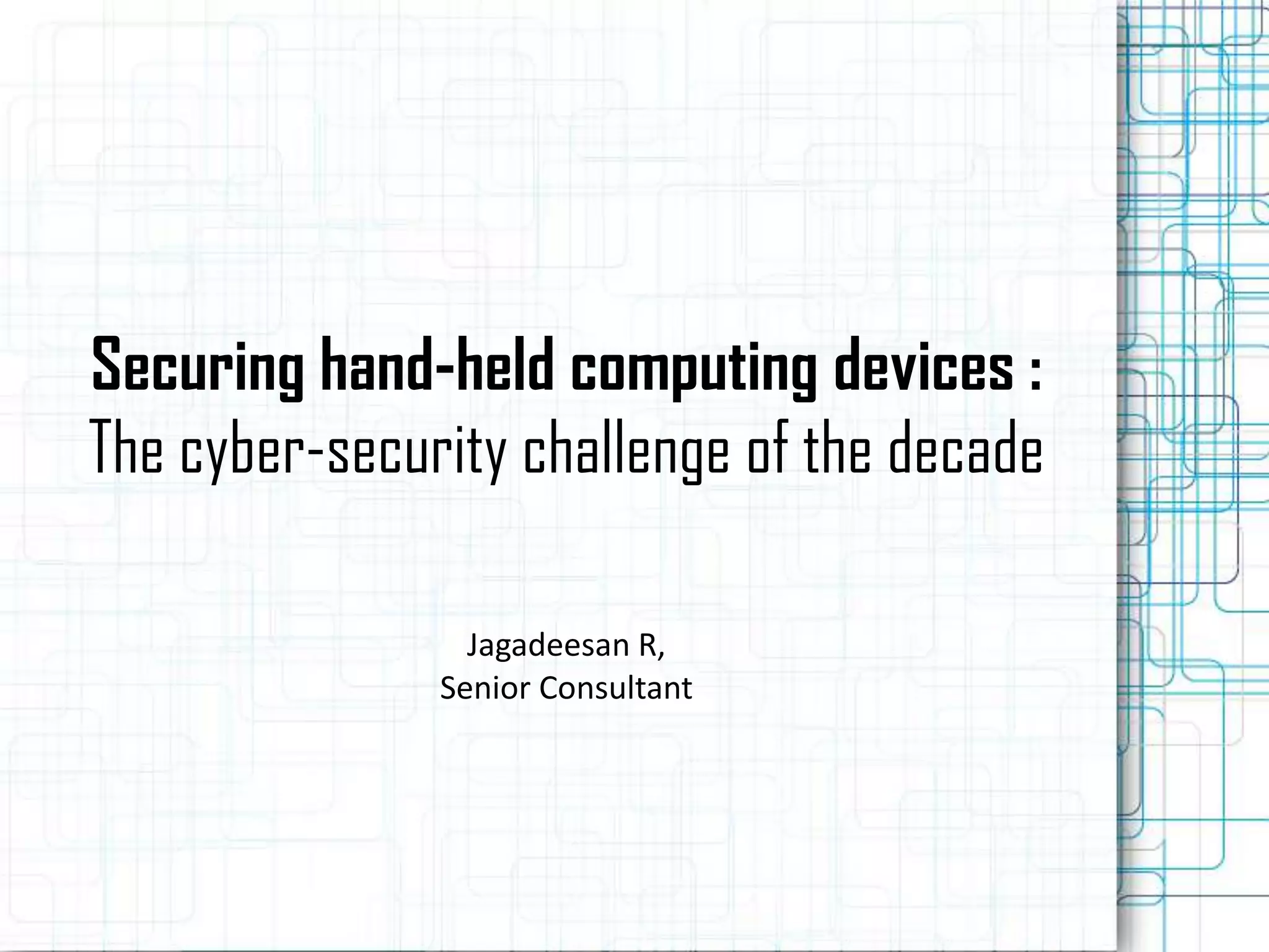 The hand-held market is growing rapidly but security for these devices hasn't kept pace. Common vulnerabilities include malware, backdoors, and insecure storage of sensitive user information. While platforms like Blackberry and iOS are more secure, Android allows direct app installation which increases risks. Timely software updates are also a challenge. As functionality increases on these powerful devices, so does potential for misuse. Security vendors are working to provide anti-virus, encryption, and other tools to enhance mobile security.