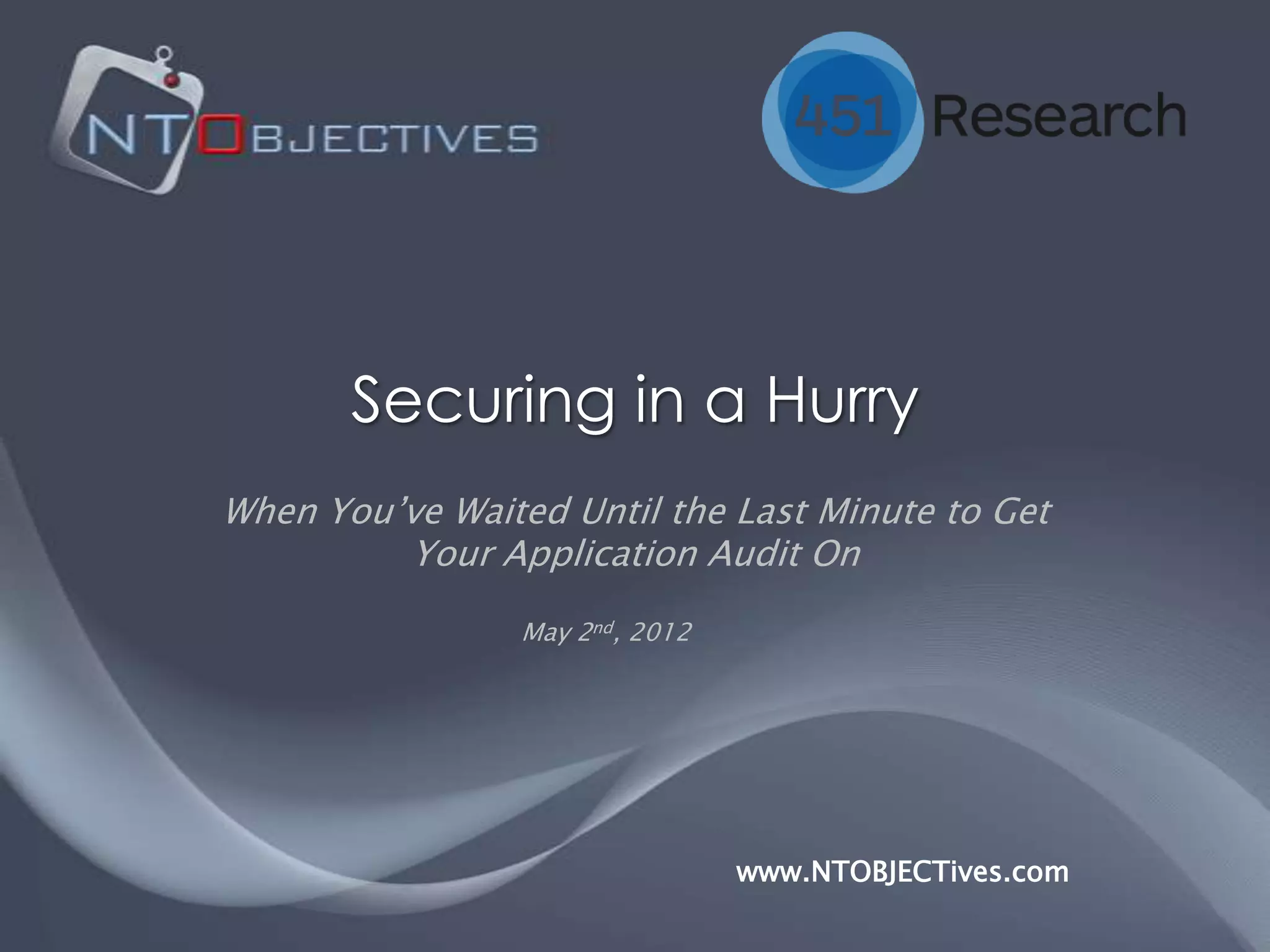 The document discusses the urgency of securing applications, especially when time is limited for audits or assessments. It emphasizes the need for a comprehensive understanding of the applications, the importance of both automated and manual penetration testing, and the challenges posed by various vulnerabilities. Additionally, it outlines the preparation required for effective vulnerability scanning and the necessity of communication among teams involved in application security.
