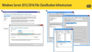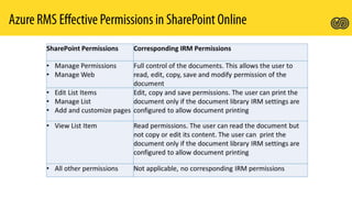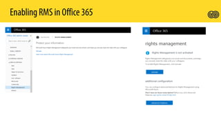 Azure Rights Management Service (RMS) enables organizations to protect sensitive information through various components and licensing plans, allowing integration with Office 365 and on-premises servers. It supports document protection across multiple platforms and file formats, enabling users to create, consume, and manage protected content effectively. Key features include departmental templates, tracking document usage, and the ability to revoke access.