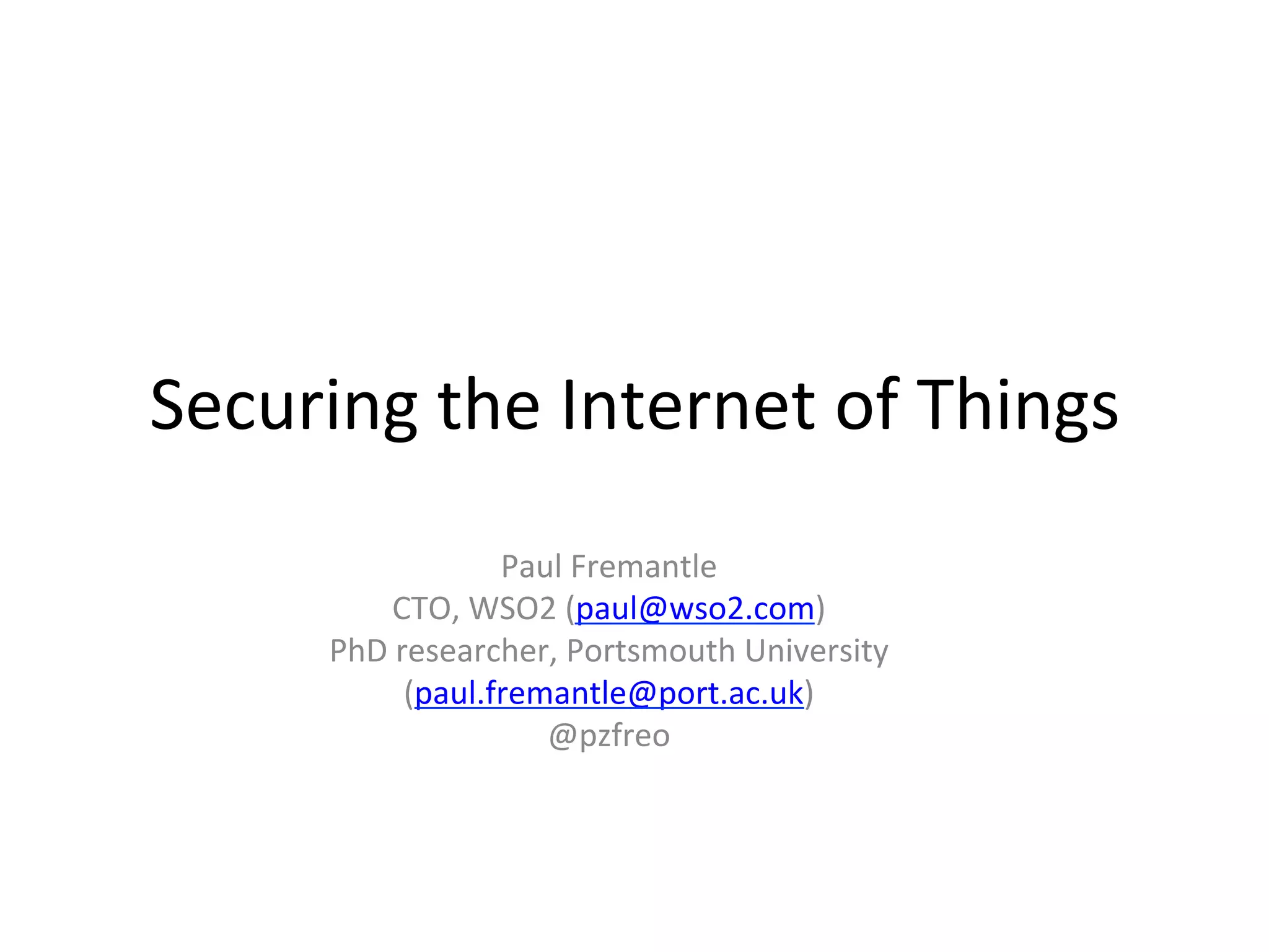 This document discusses securing the Internet of Things (IoT). It notes that IoT devices differ from traditional devices in ways that impact security, such as limited ability to update firmware. It recommends not relying on security through obscurity and discusses practical crypto implementations for small devices. The document also covers securing communication protocols like MQTT, CoAP and DTLS, as well as approaches like OAuth2 for authentication without passwords on devices. It describes a demonstration of using OAuth2 with MQTT to limit a device's access to an API by giving it a revocable token rather than a static password.