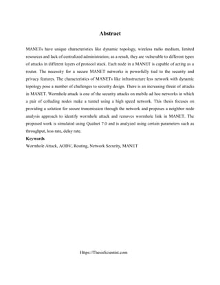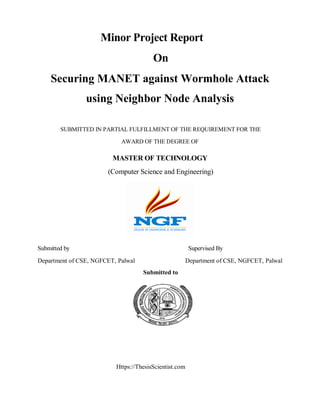 The document is a minor project report on securing Mobile Ad Hoc Networks (MANETs) against wormhole attacks using neighbor node analysis. It highlights the inherent vulnerabilities of MANETs due to their dynamic topology and lack of centralized administration, proposing a simulation-based solution to improve secure transmission. The study emphasizes the need to address various types of attacks, particularly highlighting the necessity for robust security mechanisms in the context of rapidly changing network conditions.