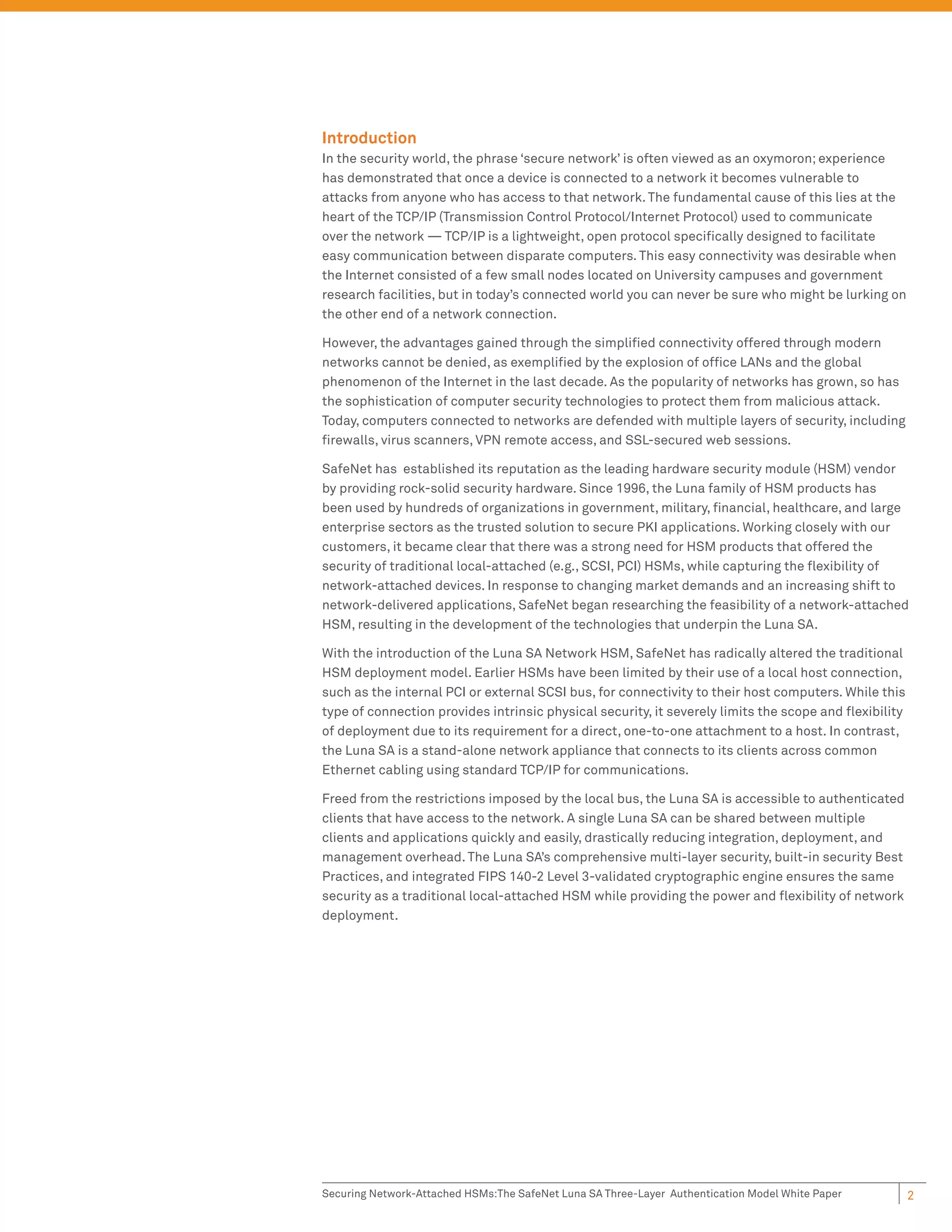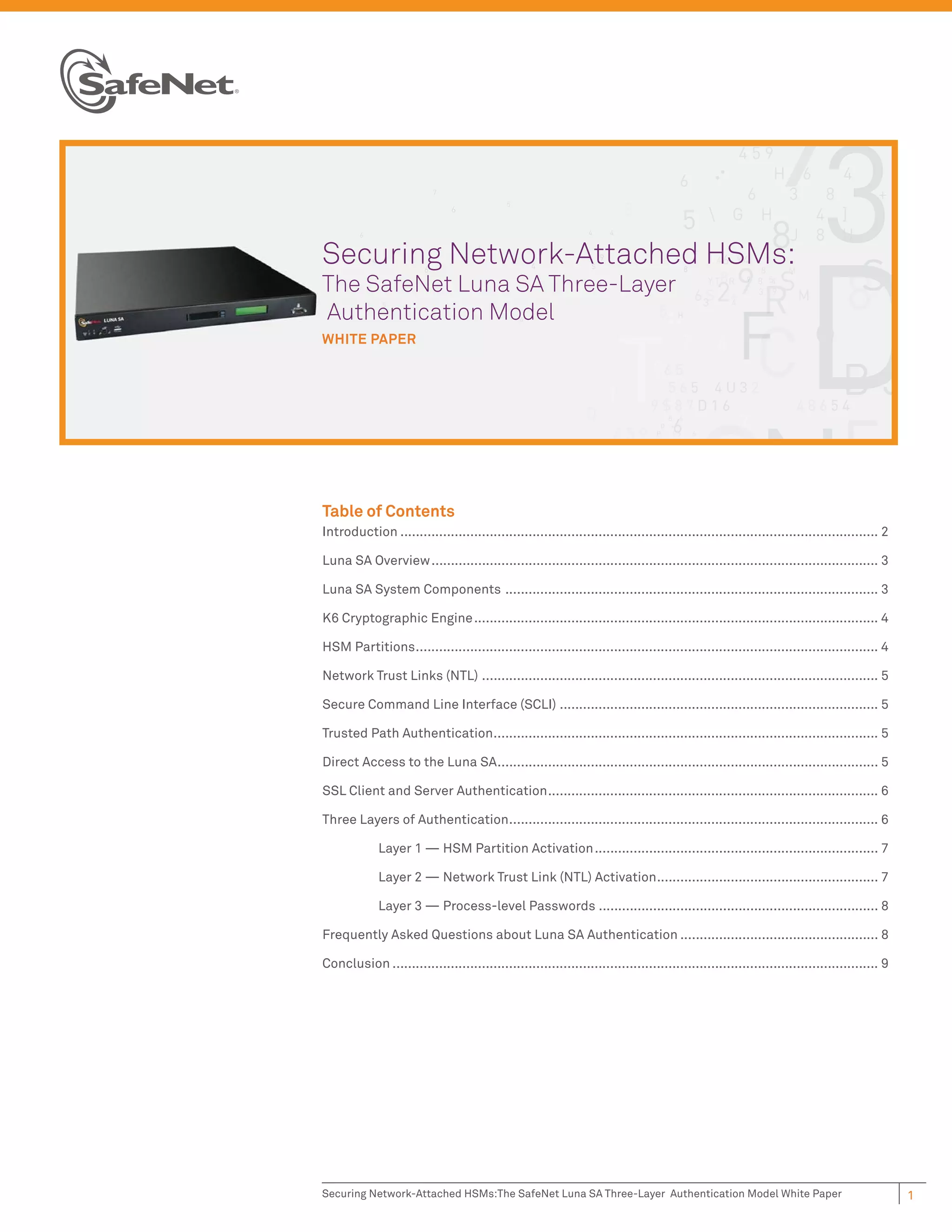 The document discusses the SafeNet Luna SA, a network-attached hardware security module (HSM) that employs a three-layer authentication model for enhanced security in cryptographic operations. It outlines the Luna SA's architecture, including its k6 cryptographic engine, hsm partitions, and the use of network trust links for secure communication between clients and the HSM. Key features include support for multiple applications through shared partitions, SSL authentication, and optional two-factor authentication for elevated security measures.