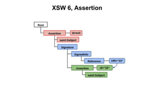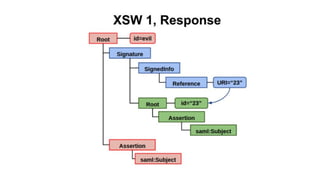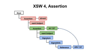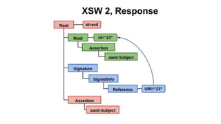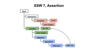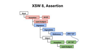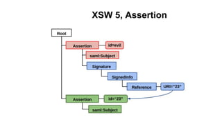 The document discusses security measures for Single Sign-On (SSO) using SAML, addressing vulnerabilities like XML Signature Wrapping (XSW) attacks and the importance of digital signatures. It emphasizes the need for penetration testing and implementations that prevent XSW, including using third-party libraries that support these features. The document also mentions potential XML parser issues with comments in signatures and recommends best practices for preventing associated attacks.