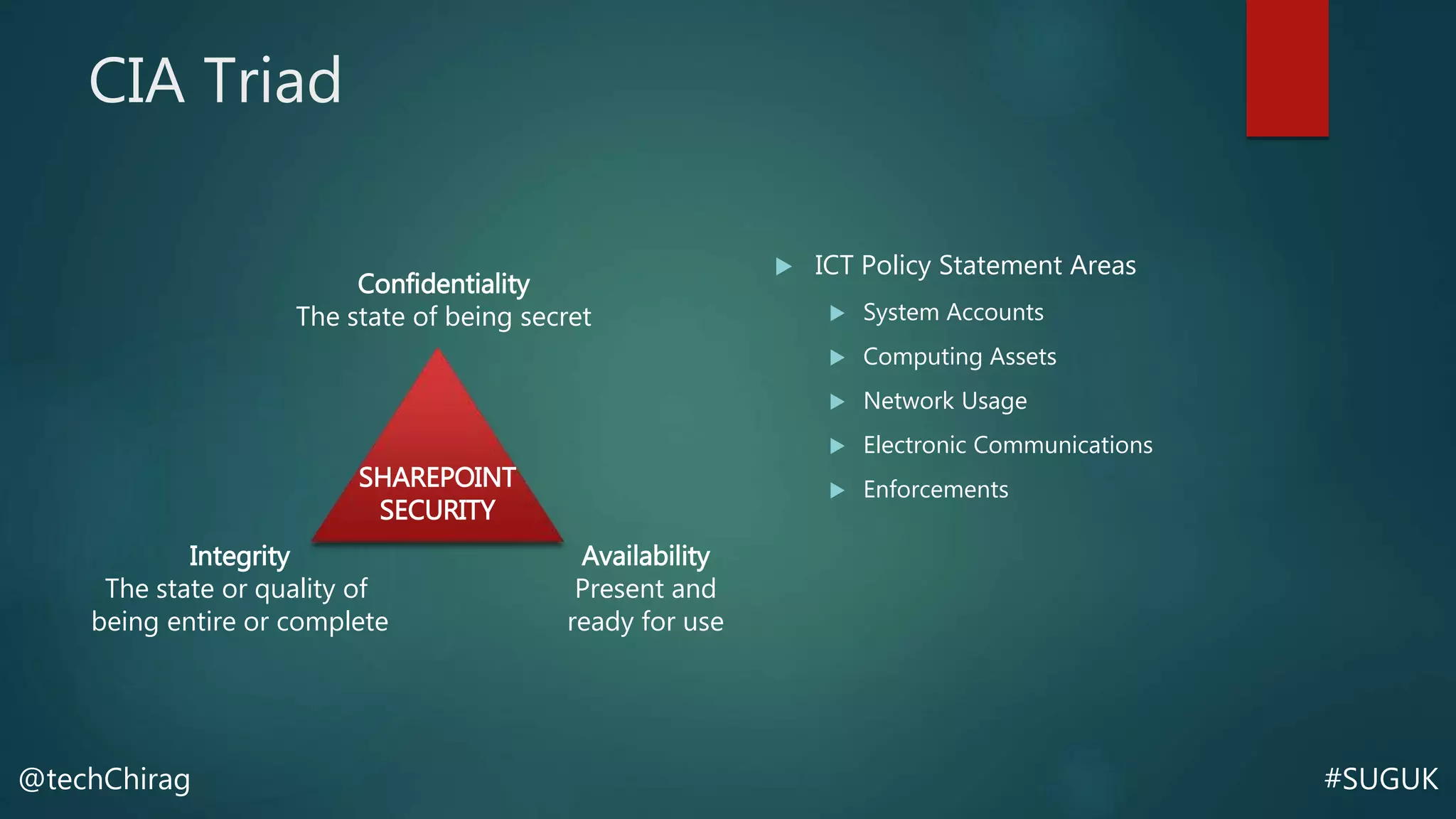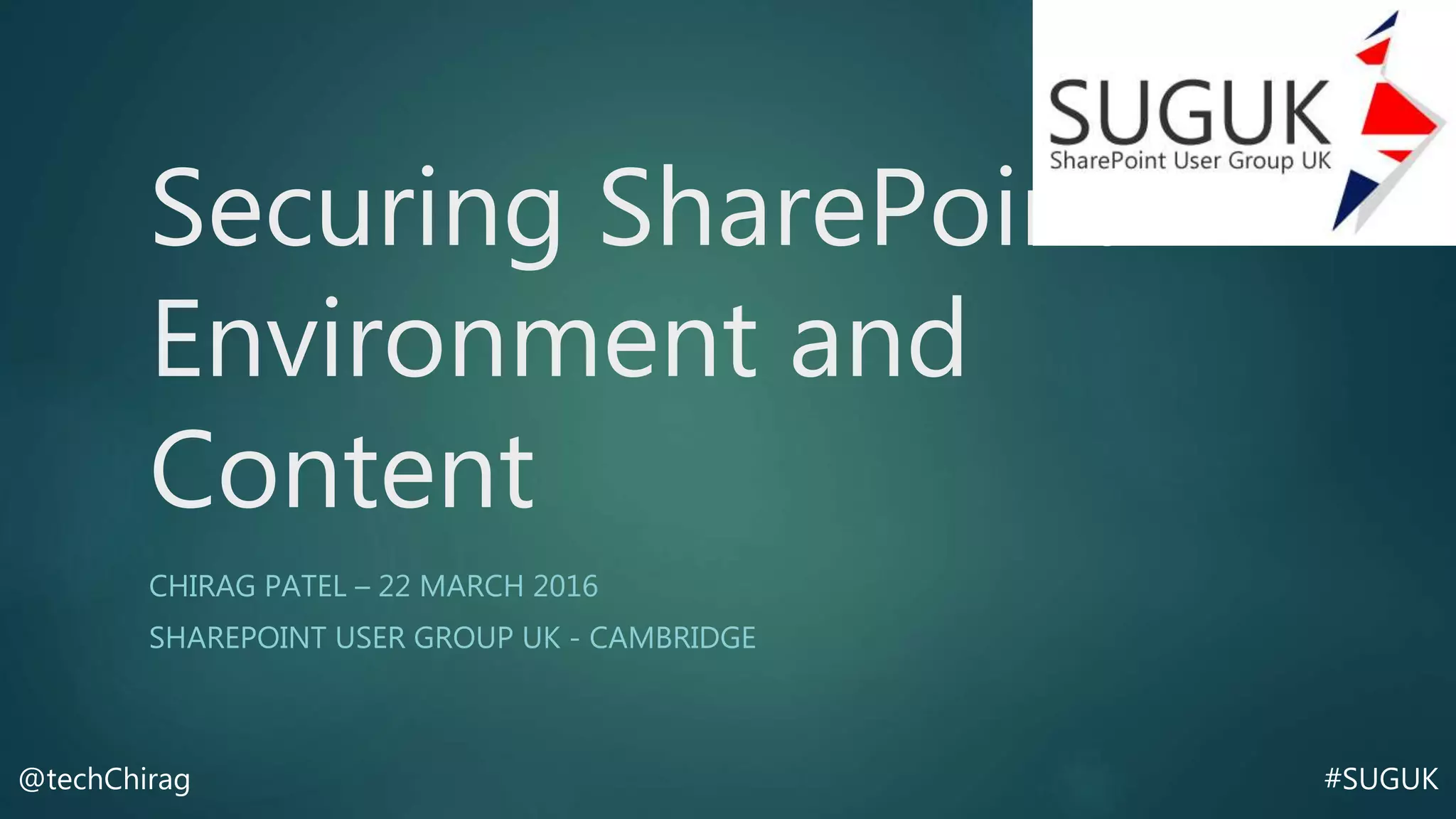 This document summarizes Chirag Patel's presentation on securing the SharePoint environment and content. It discusses key security concepts like the CIA triad of confidentiality, integrity and availability. It provides best practices for platform security, authentication, encryption and antivirus in SharePoint. It also describes the various administrator roles and how to define policies for users, permissions, information management and external sharing. Finally, it covers content security, managing audiences, data loss prevention, backups and restores in SharePoint.