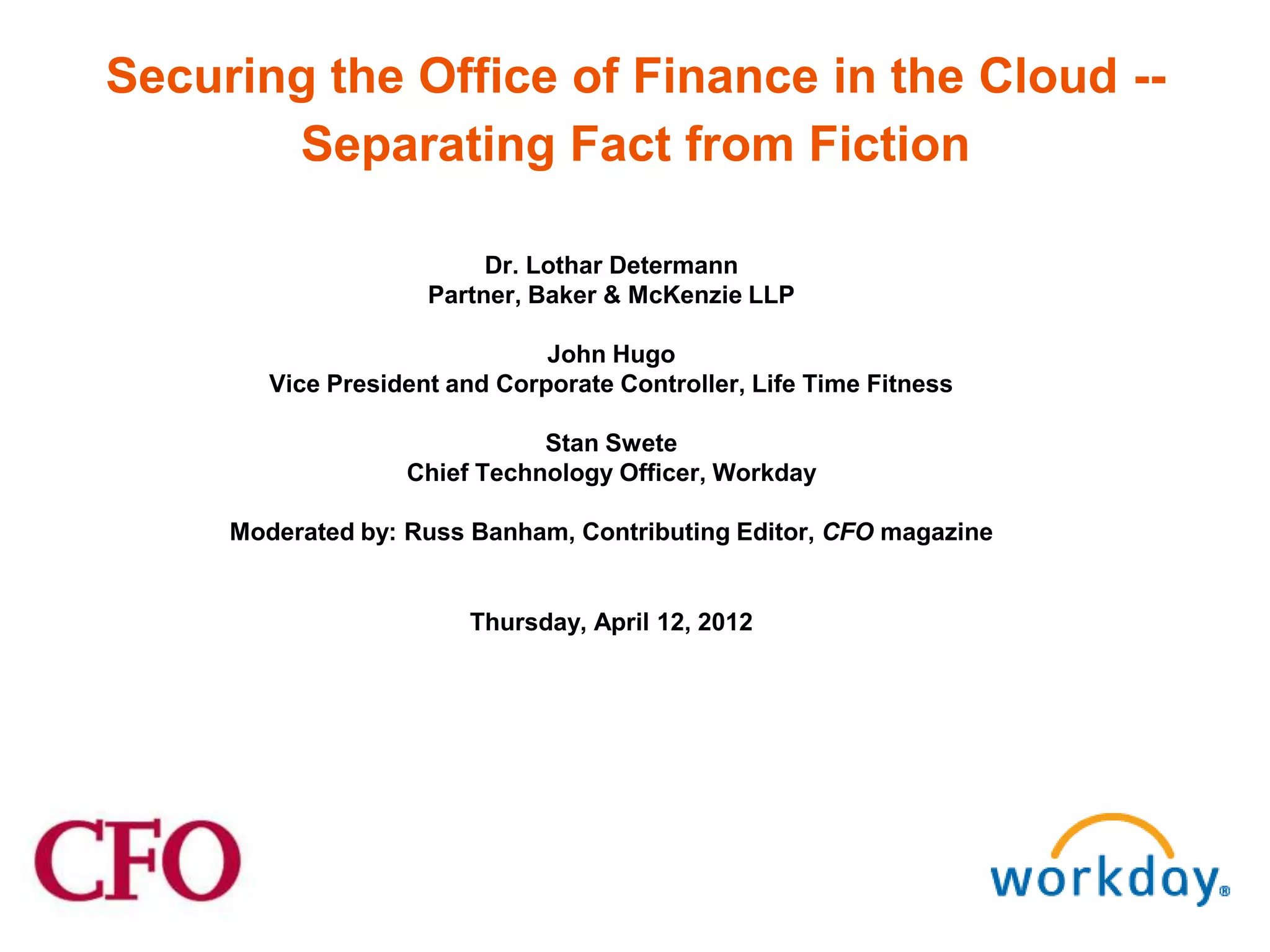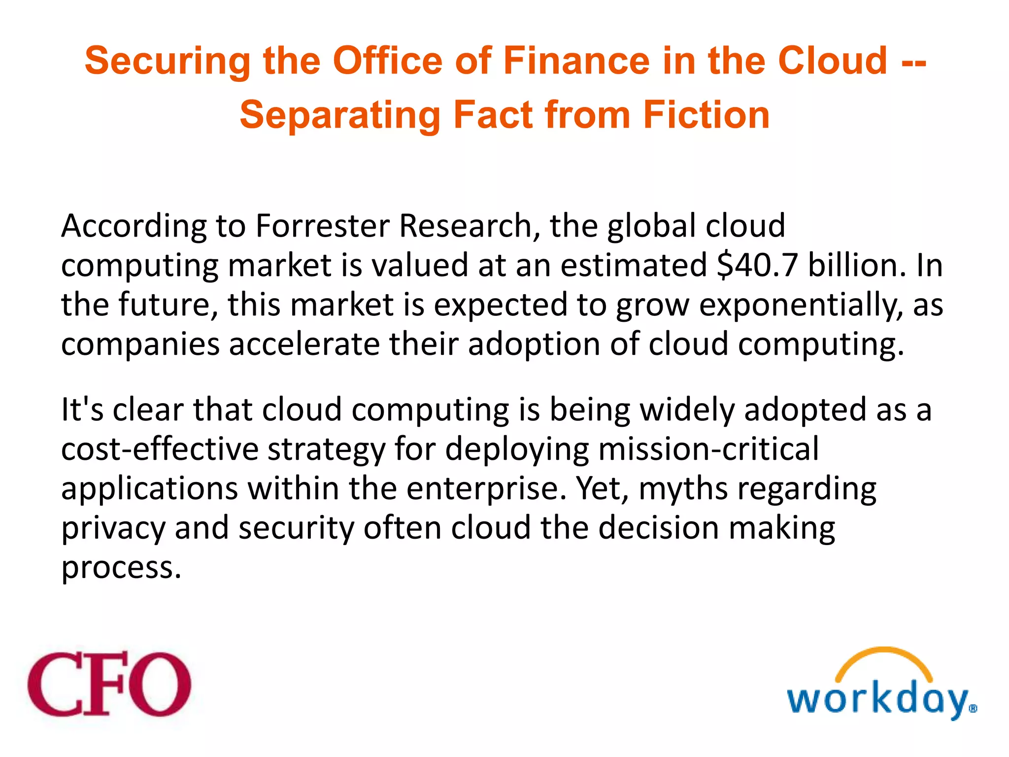 The document discusses the growth of cloud computing and its implications for finance, highlighting common myths related to security and data privacy. It emphasizes that the safety of data in the cloud depends on the security measures in place, regardless of whether the systems are managed in-house or by a vendor. Furthermore, it advises companies to rigorously evaluate cloud service providers based on their security standards and compliance capabilities.