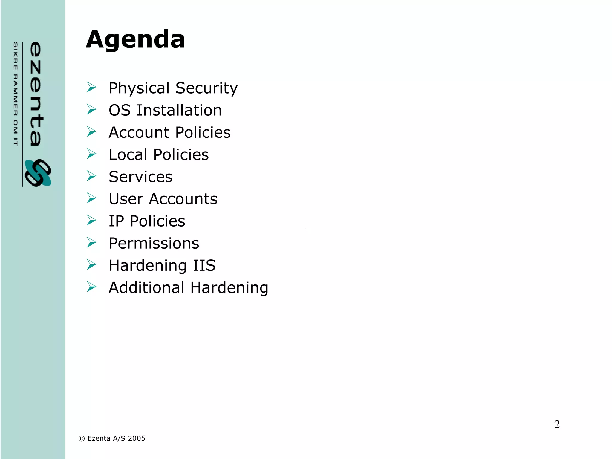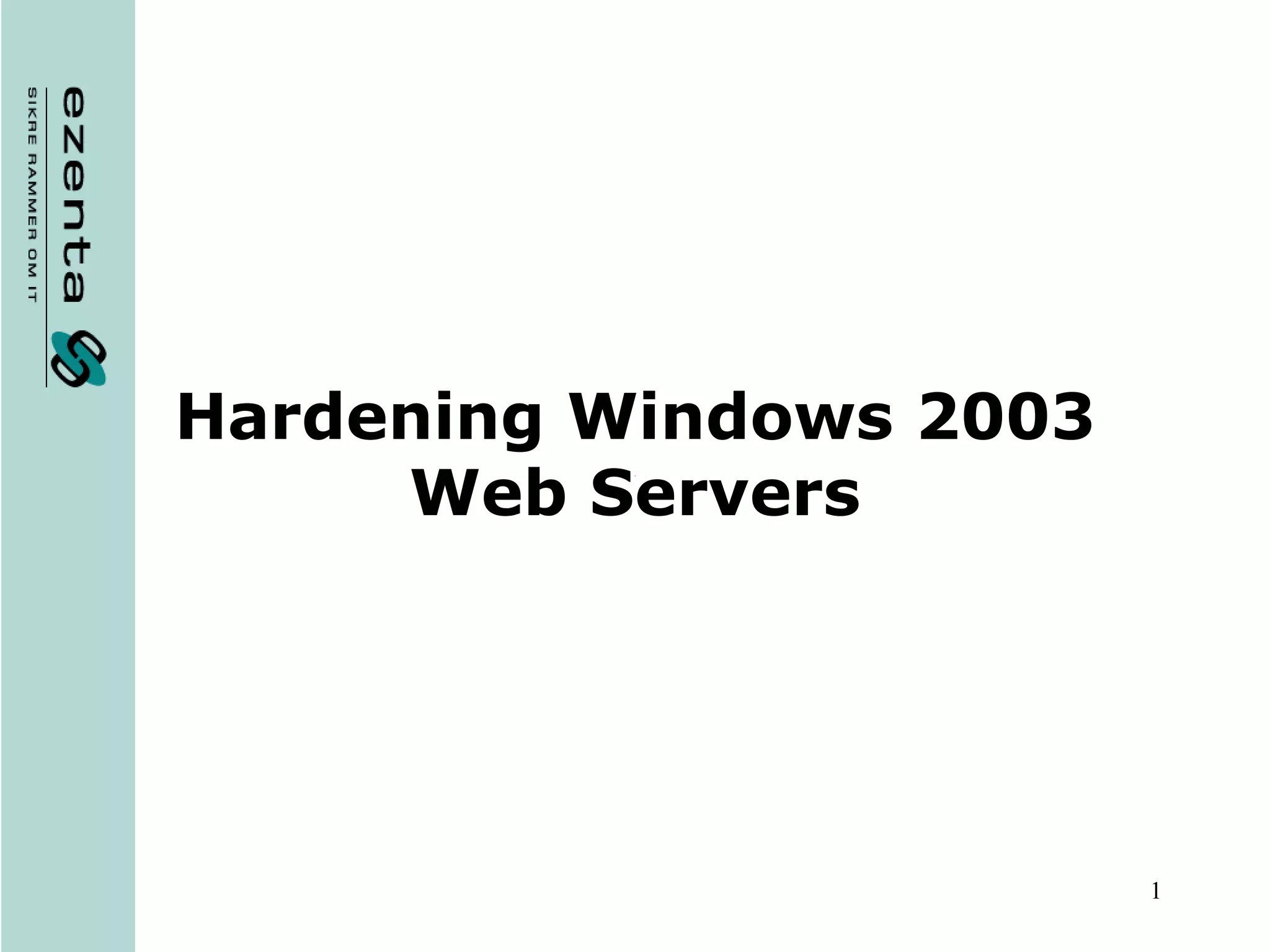 This document provides an agenda for hardening Windows 2003 web servers. It covers various topics including physical security, OS installation, account policies, local policies, services configuration, user accounts, IP policies, permissions, hardening IIS, and additional hardening techniques. The goal is to create a secure environment and maintain security by configuring the OS, services, user accounts, permissions and IIS according to security best practices.