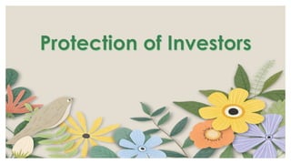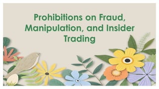 The Securities Regulation Code establishes rules for regulating securities transactions in the Philippines. It was enacted in 2000 and divides regulations into 13 chapters covering topics like insider trading, market manipulation, and disclosure requirements. The code aims to protect investors, encourage stock ownership, and promote fair securities markets. Key provisions address registration of securities offerings, prohibitions on fraudulent or manipulative practices, and restrictions on trading by corporate insiders using non-public information. Violations can lead to civil and criminal penalties including large fines and imprisonment.