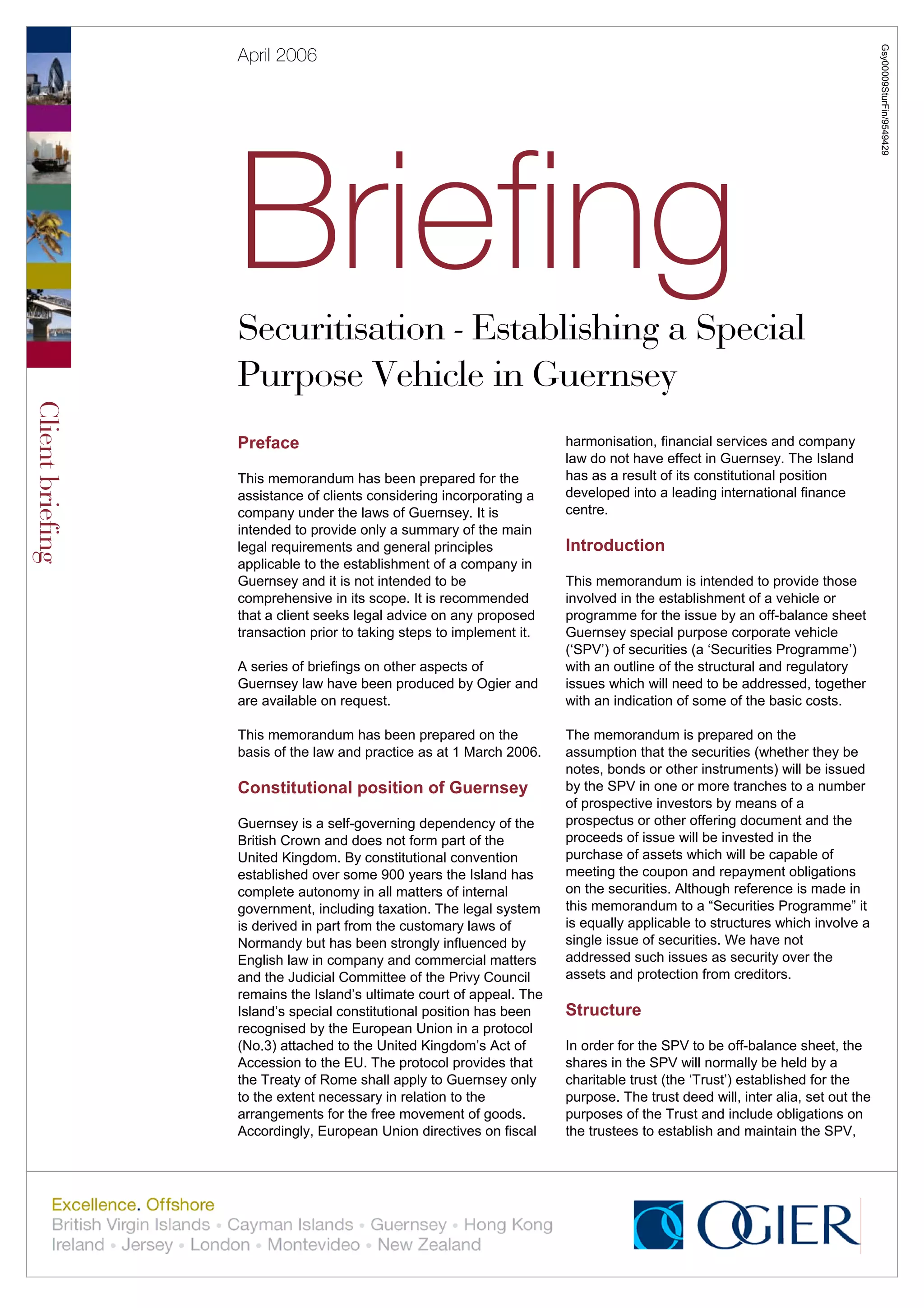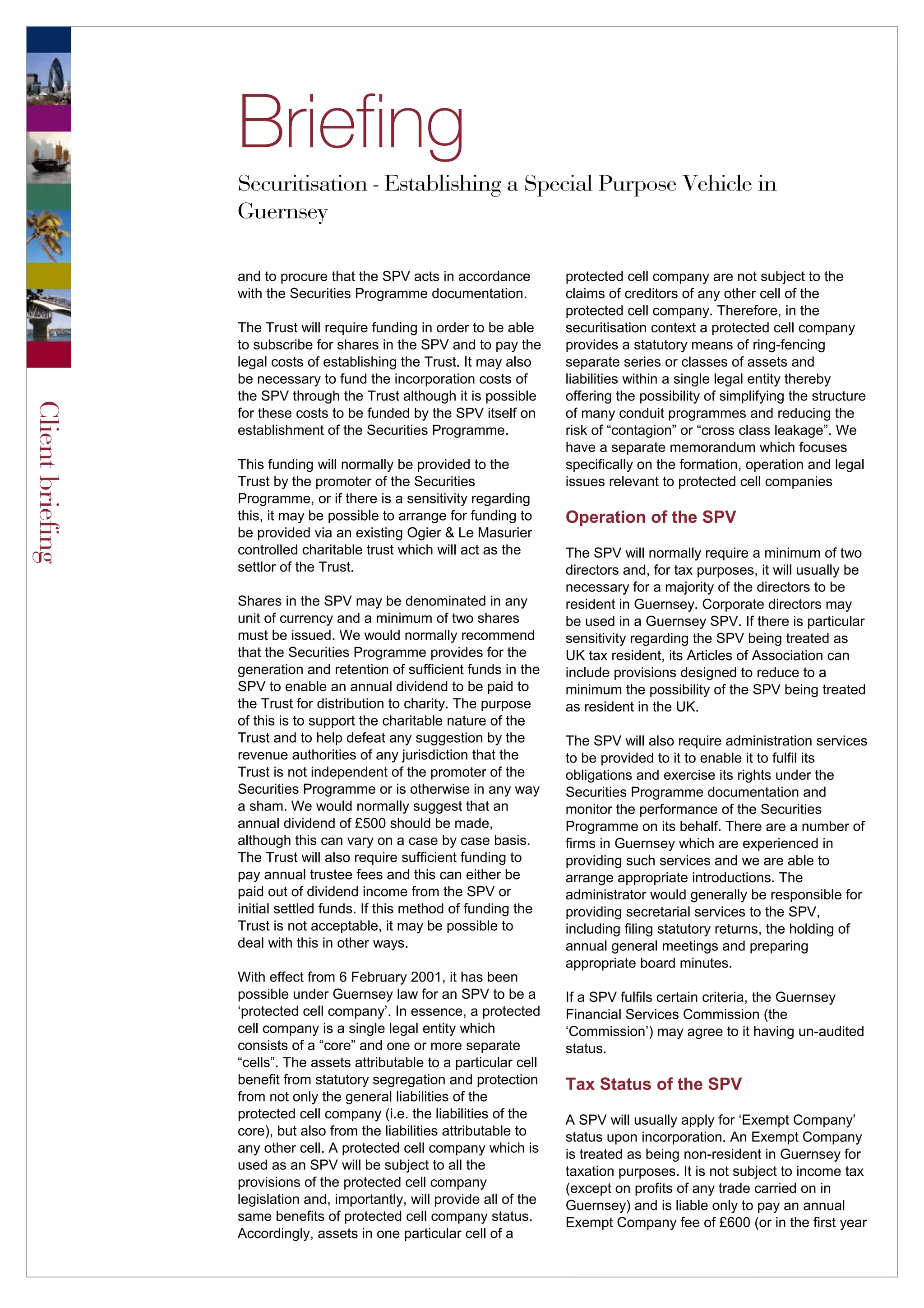This document provides an overview of establishing a special purpose vehicle (SPV) in Guernsey for securitization. It discusses that the SPV would be held by a charitable trust for off-balance sheet treatment. The SPV would require directors, administration services, and regulatory approval. Costs for establishing the SPV and trust are estimated, including incorporation fees, annual administration fees, and legal fees. Key steps for establishing the structure are outlined.