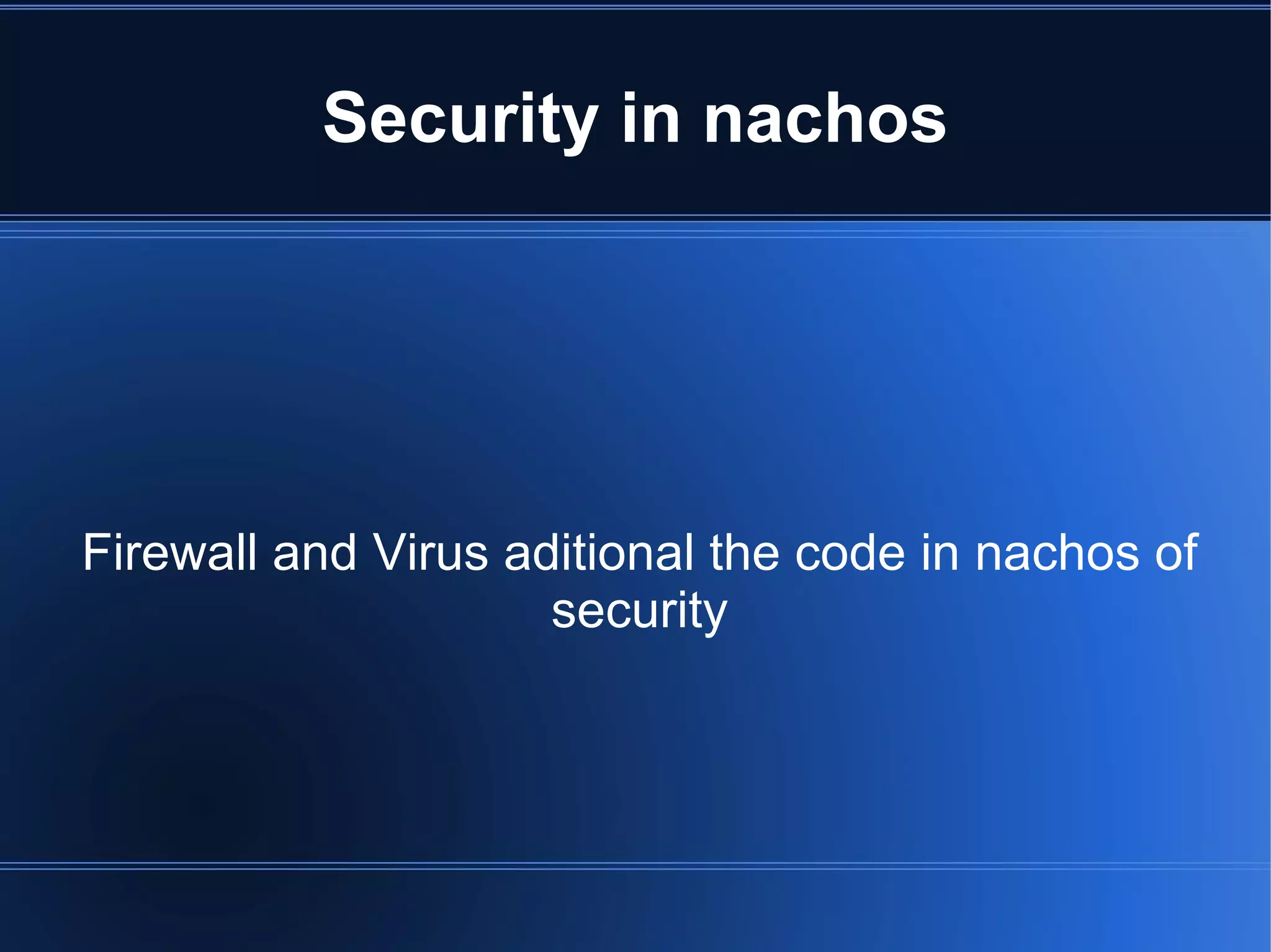 Nachos implements security features like a firewall and privilege system to protect system files and resources. The firewall examines packets to determine if they should be forwarded or blocked. Privilege objects can perform privileged actions, like modifying system files, by calling doPrivileged methods on the NachosSecurityManager. This allows authorization for changes to be managed in a centralized way.