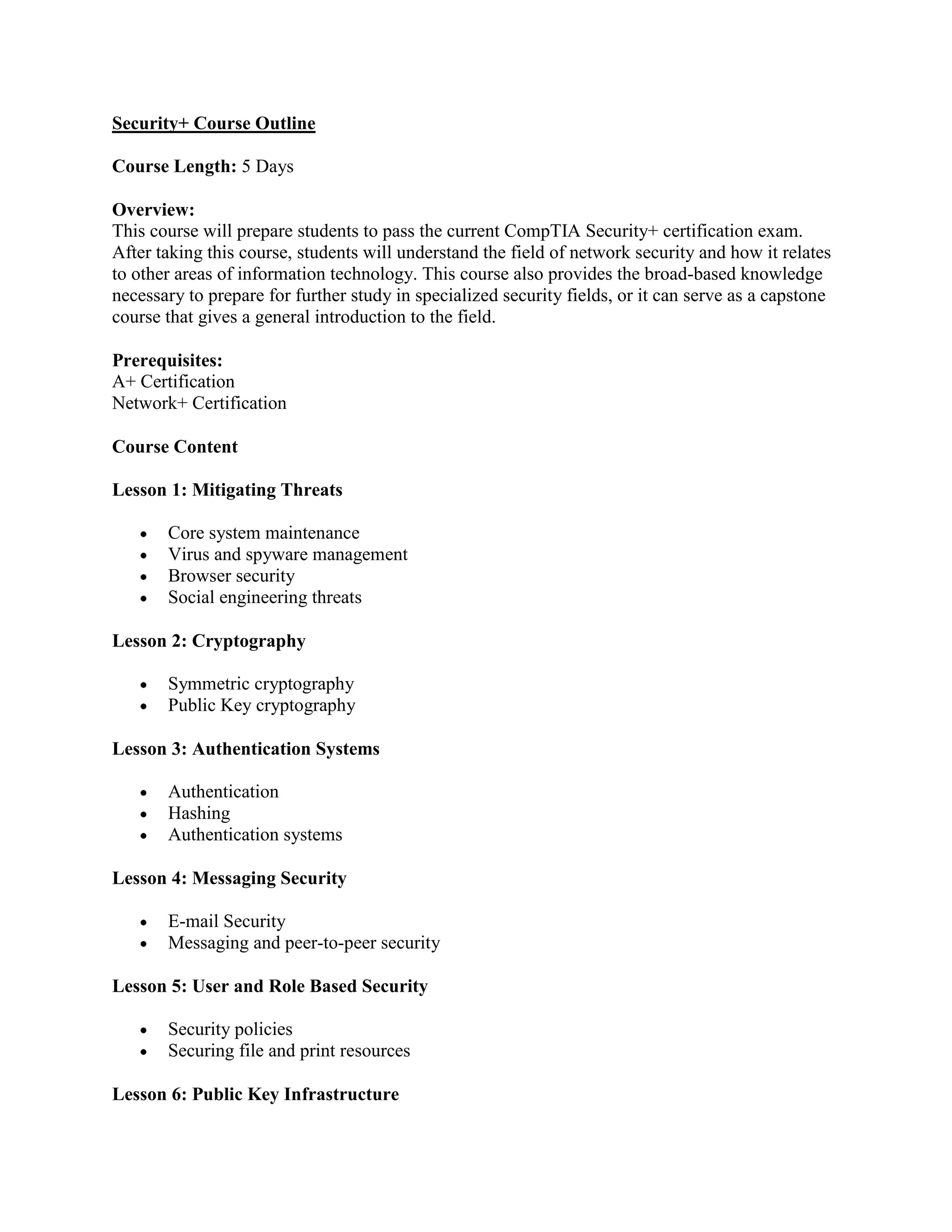 This 5-day course covers network security and prepares students to pass the CompTIA Security+ certification exam. The course covers topics like mitigating threats, cryptography, authentication systems, messaging security, user and role-based security, public key infrastructure, access security, ports and protocols, wireless security, remote access security, auditing and logging, network-to-network connections, organizational security, and business continuity. Prerequisites include A+ and Network+ certification.