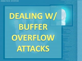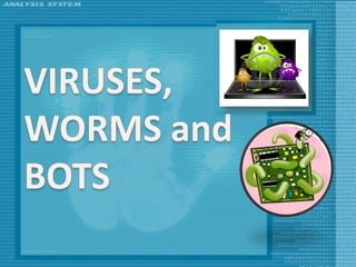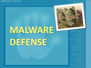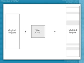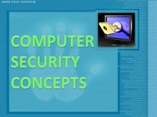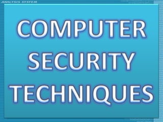 The document discusses various topics related to computer security including threats, attacks, intruders, malware, and security techniques. It describes common security threats like viruses, worms, bots, rootkits, and intruders. It also covers computer security objectives of confidentiality, integrity and availability. Authentication, access control, intrusion detection, and malware defense are discussed as security techniques.