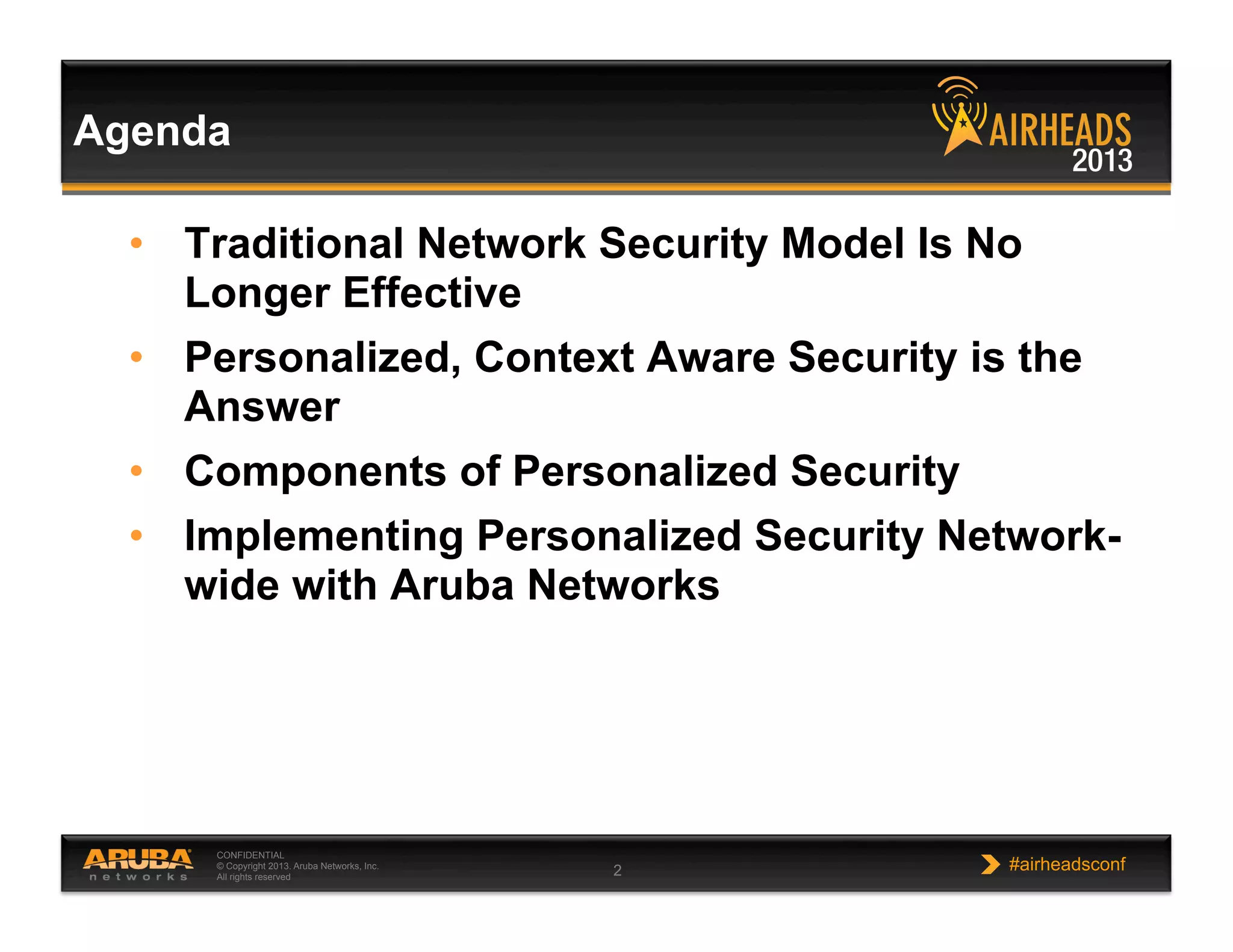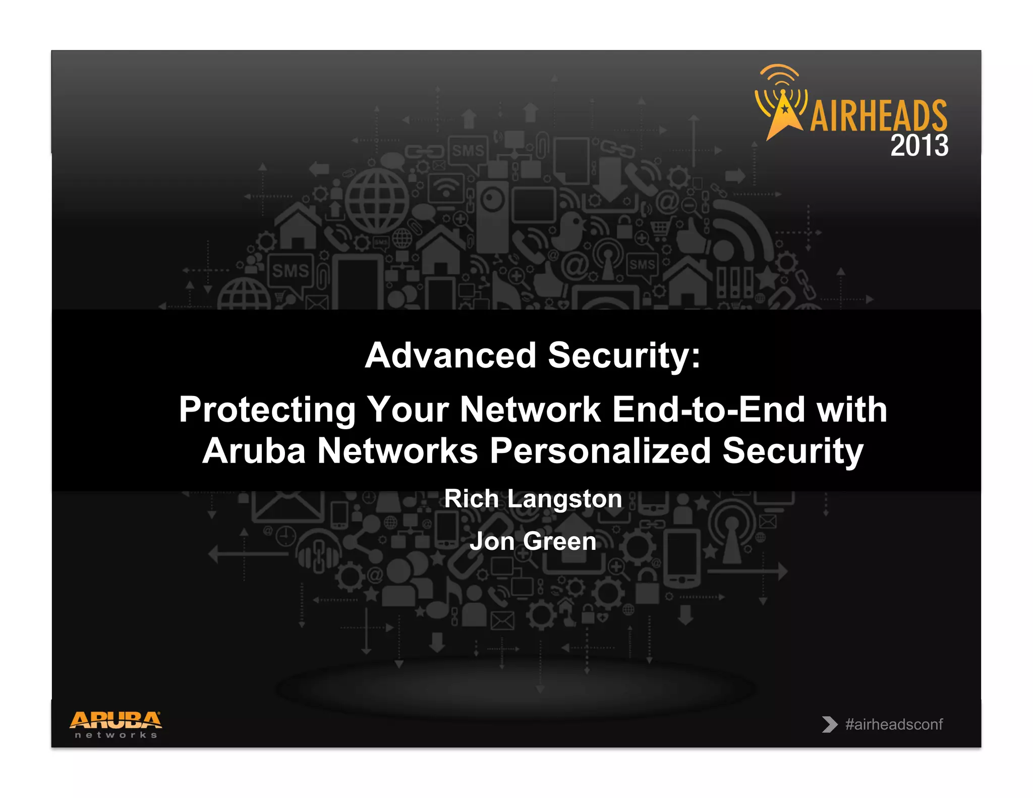 The document discusses implementing personalized network security using Aruba Networks products. It describes how traditional network security models are no longer effective due to factors like mobility and BYOD. Personalized, context-aware security which identifies users, devices, applications and locations is presented as a better approach. The Aruba security architecture is described, which uses ClearPass for policy management and enforcement across wireless, wired and VPN connections. Methods for strong authentication, device profiling, role-based access controls and guest access are covered to implement personalized security network-wide.