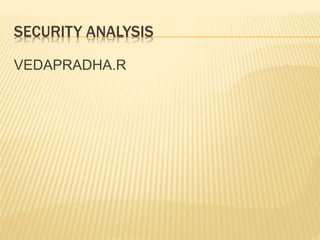 This document discusses security analysis and different types of analysis used for it. Fundamental analysis looks at economic, industry and company factors, while technical analysis examines price trends. Fundamental analysis involves studying economic indicators, industry dynamics and financial statements. Technical analysis relies on the assumptions that market behavior is predictable and share prices discount all information. Different technical analysis techniques are described, including charting price movements over time and identifying support and resistance levels. The limitations of solely relying on technical or fundamental analysis are also noted.