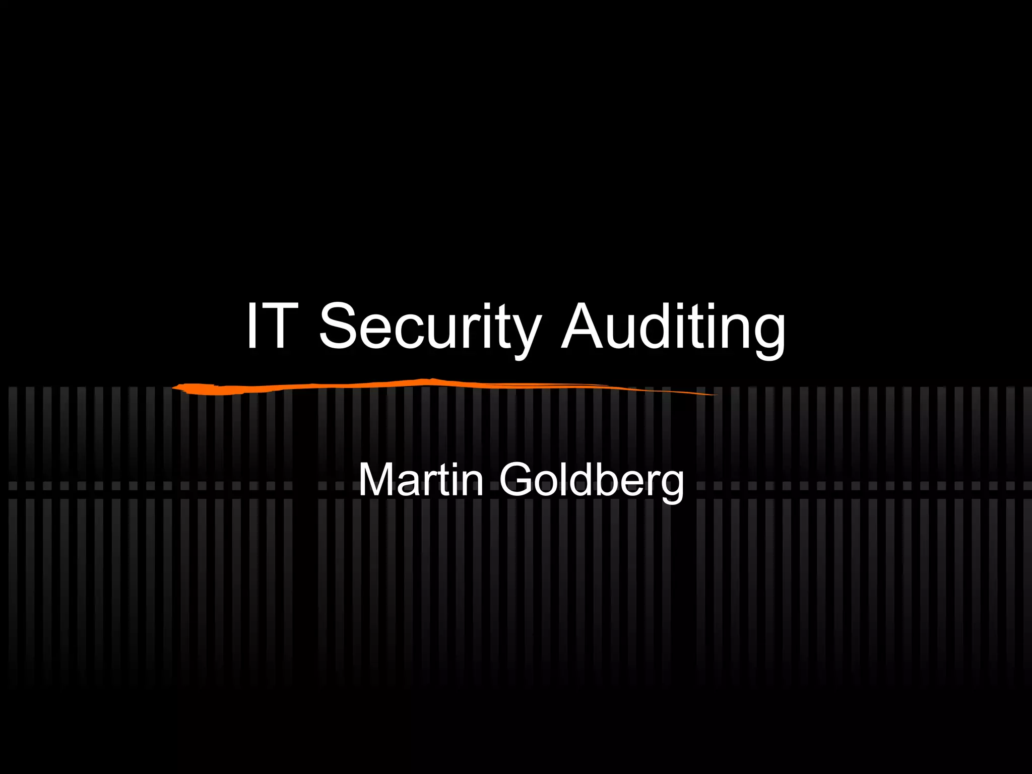 An IT security audit involves independently examining an organization's IT systems, controls, policies and procedures. The document outlines the key steps in an IT audit including planning, testing and reporting. It also discusses defining auditors and their roles, preparing for an audit, and how audits are conducted at the application level to assess controls related to administration, security, disaster recovery and more. The goal of an audit is to evaluate security adequacy and recommend improvements.
