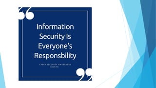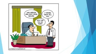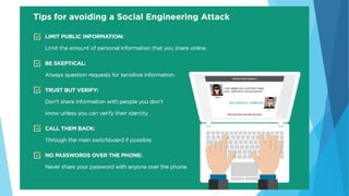 This document provides training on cybersecurity best practices for Borough of West Chester personnel. It defines cybersecurity as protecting information and systems from unauthorized access, use, disclosure, disruption or destruction. It outlines common cyber threats like viruses, worms, ransomware, and social engineering. It emphasizes using strong passwords, antivirus software, firewalls, and regular software updates. It also recommends avoiding malicious emails and websites, and backing up important data.
