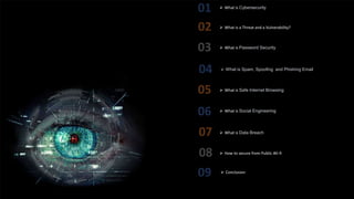 The document outlines essential cybersecurity awareness training, covering topics such as the definitions of threats and vulnerabilities, safe internet browsing practices, and the importance of strong password security. It emphasizes the significance of understanding phishing, spoofing, and social engineering, as well as the risks associated with public Wi-Fi and data breaches. By implementing the practices from the training, individuals can contribute to a secure digital environment for themselves and others.