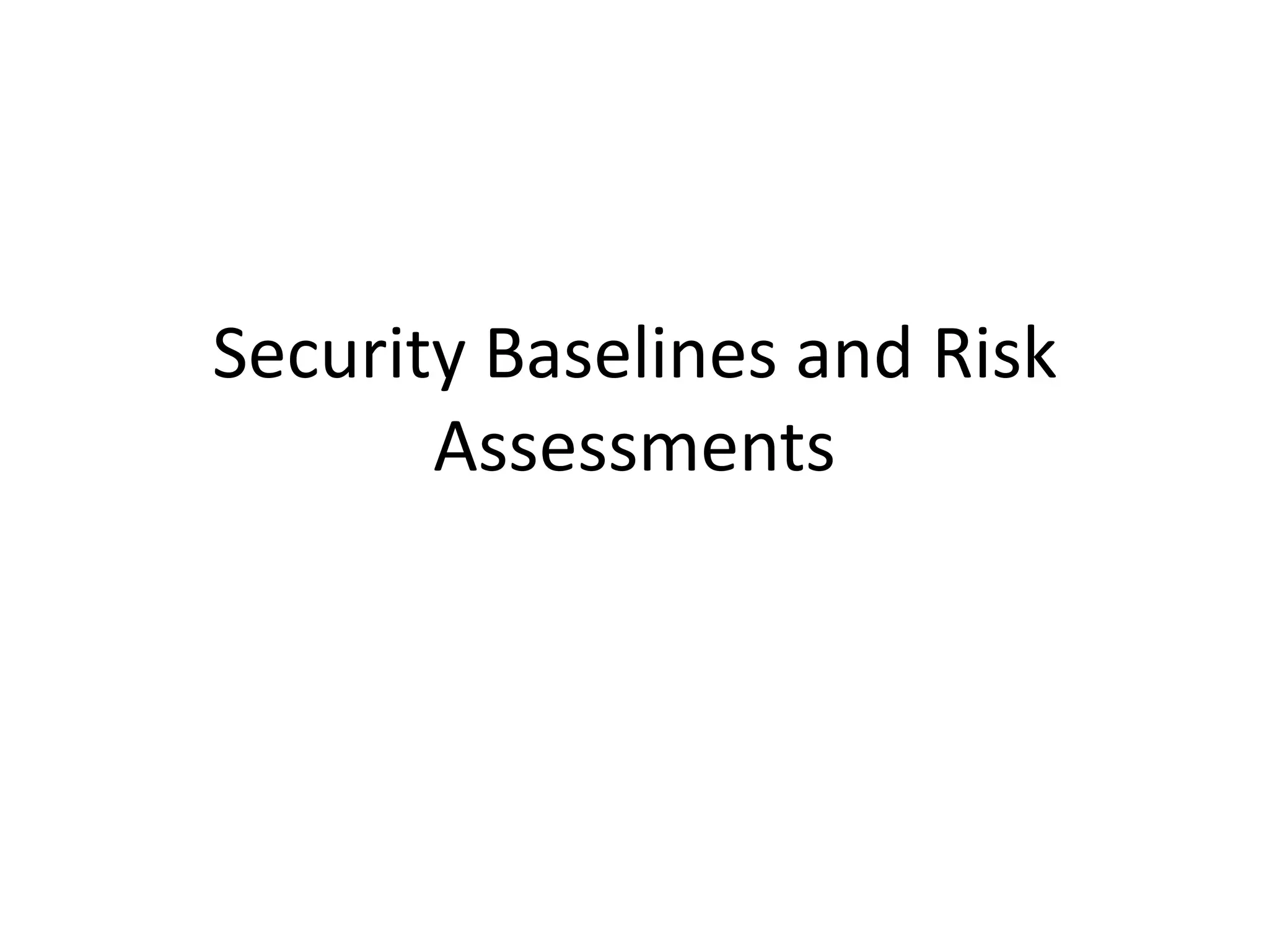 This document provides an overview of conducting a security assessment. It discusses the importance of baselines and risk assessments to establish a starting point for measuring security. It outlines key areas to assess including security organization, policies, risk management programs, and technical controls. The document provides a detailed workplan and guidelines for assessing management controls, operations, applications, databases, networks, remote access, and emergency response. The goal is to identify strengths, weaknesses, and risks to help prioritize security improvements.