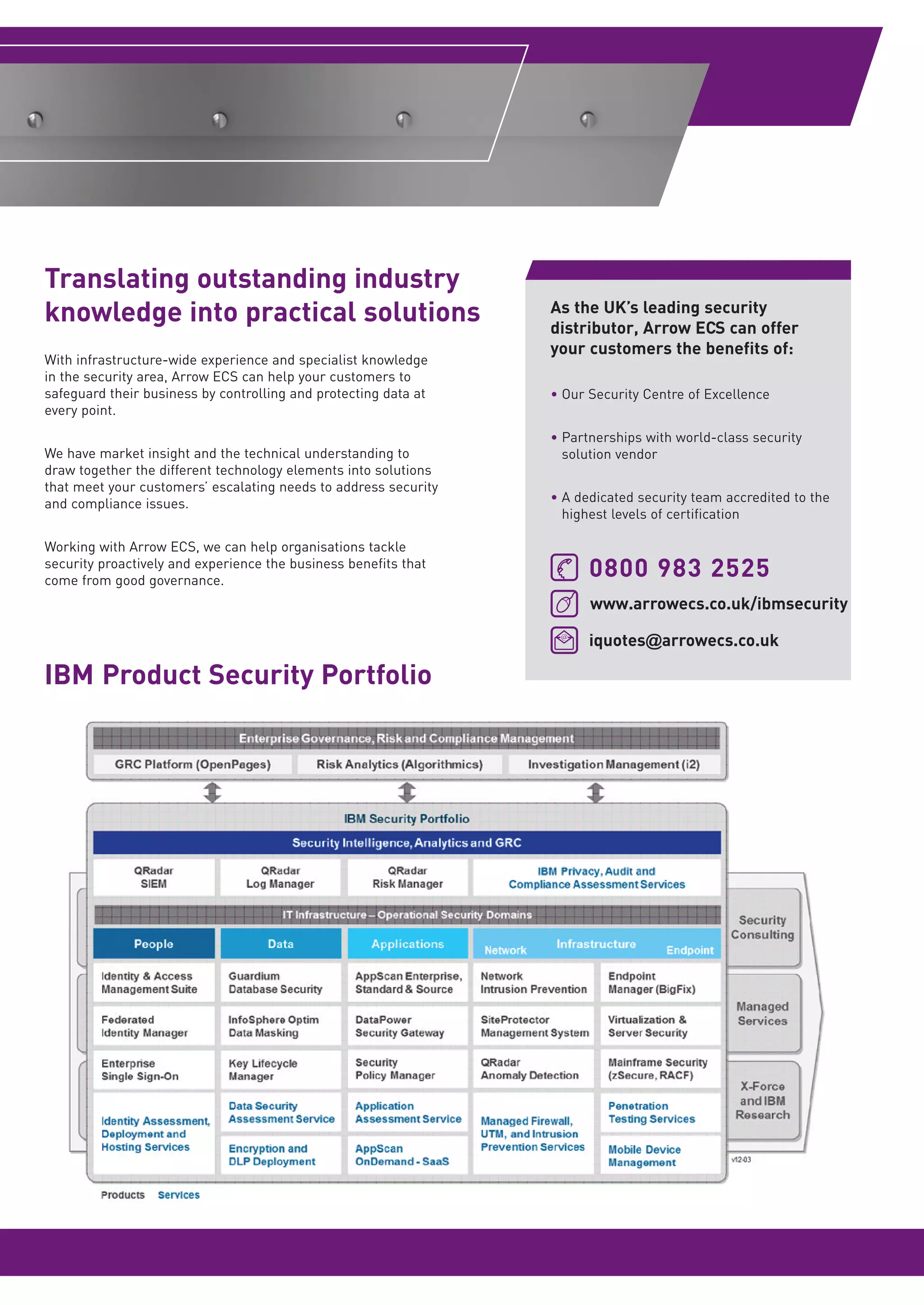 Arrow ECS is a leading UK security distributor that can offer customers solutions from its Security Center of Excellence and partnerships with top security vendors. It has expertise in translating industry knowledge into practical security solutions for issues like safeguarding data, securing the network and data center, and ensuring compliance. Arrow ECS works with IBM security products to help organizations address escalating security and compliance needs.