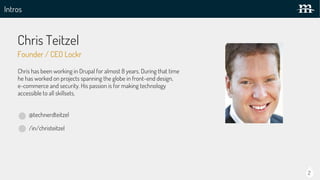 This document is a guide on Drupal security, authored by several experts in the field, highlighting key practices for securing Drupal installations and custom modules. It covers essential topics such as data encryption, site auditing best practices, and compliance with security standards like PCI DSS and HIPAA. Additionally, it provides tools and resources for enhancing Drupal security, including specific modules for encryption and key management.