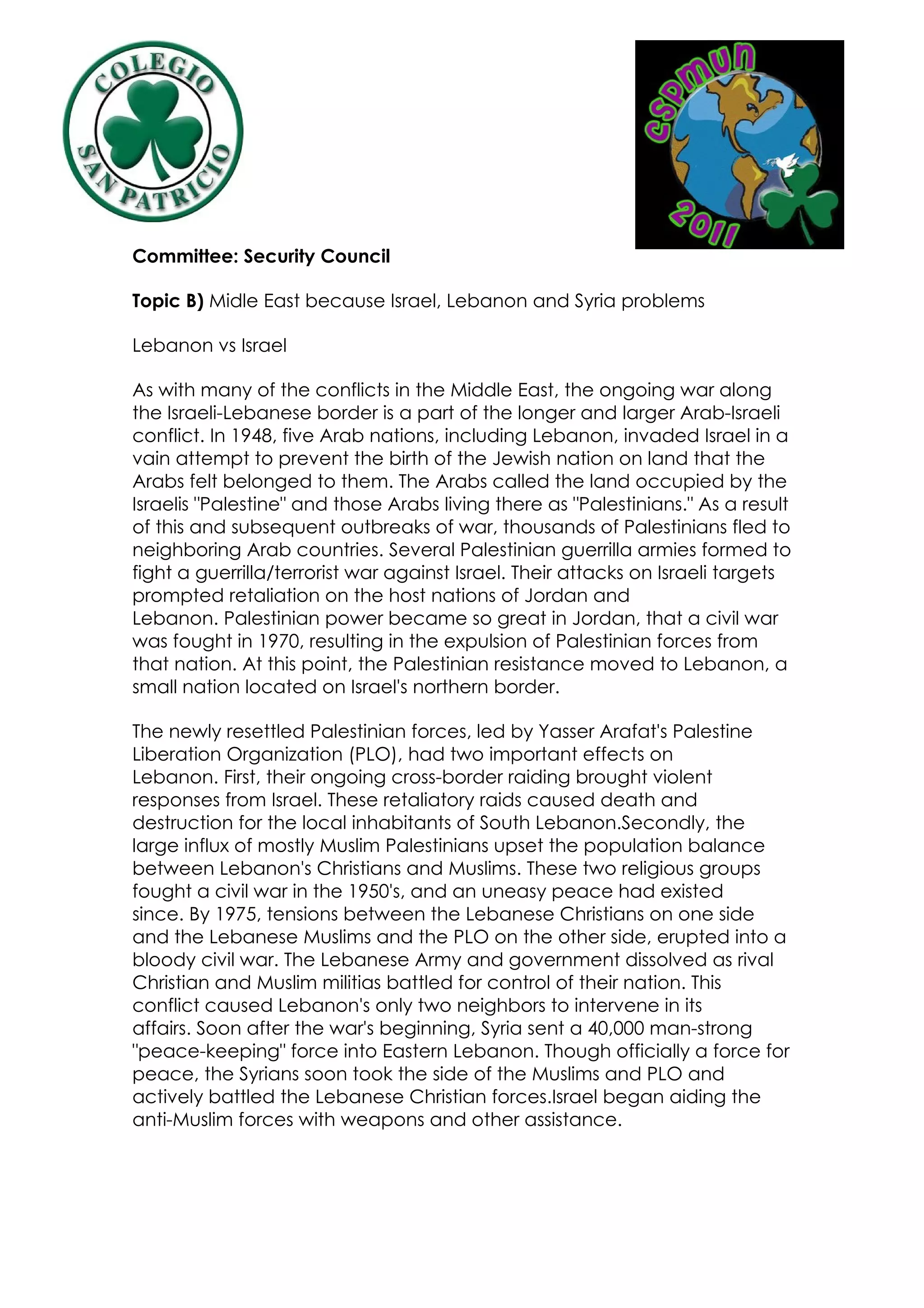 The document discusses the ongoing conflicts between Israel and its neighbors Lebanon and Syria. It provides background on how the Arab-Israeli conflict led Palestinian groups like the PLO to establish bases in Lebanon, exacerbating tensions between Lebanese religious groups and triggering the Lebanese Civil War in 1975. It also describes Israel's multiple military invasions and operations in Lebanon from 1978 to 2006 aimed at the PLO and Hezbollah in response to attacks, as well as Syria's military occupation of Lebanon since 1976 and influence over Lebanese politics.