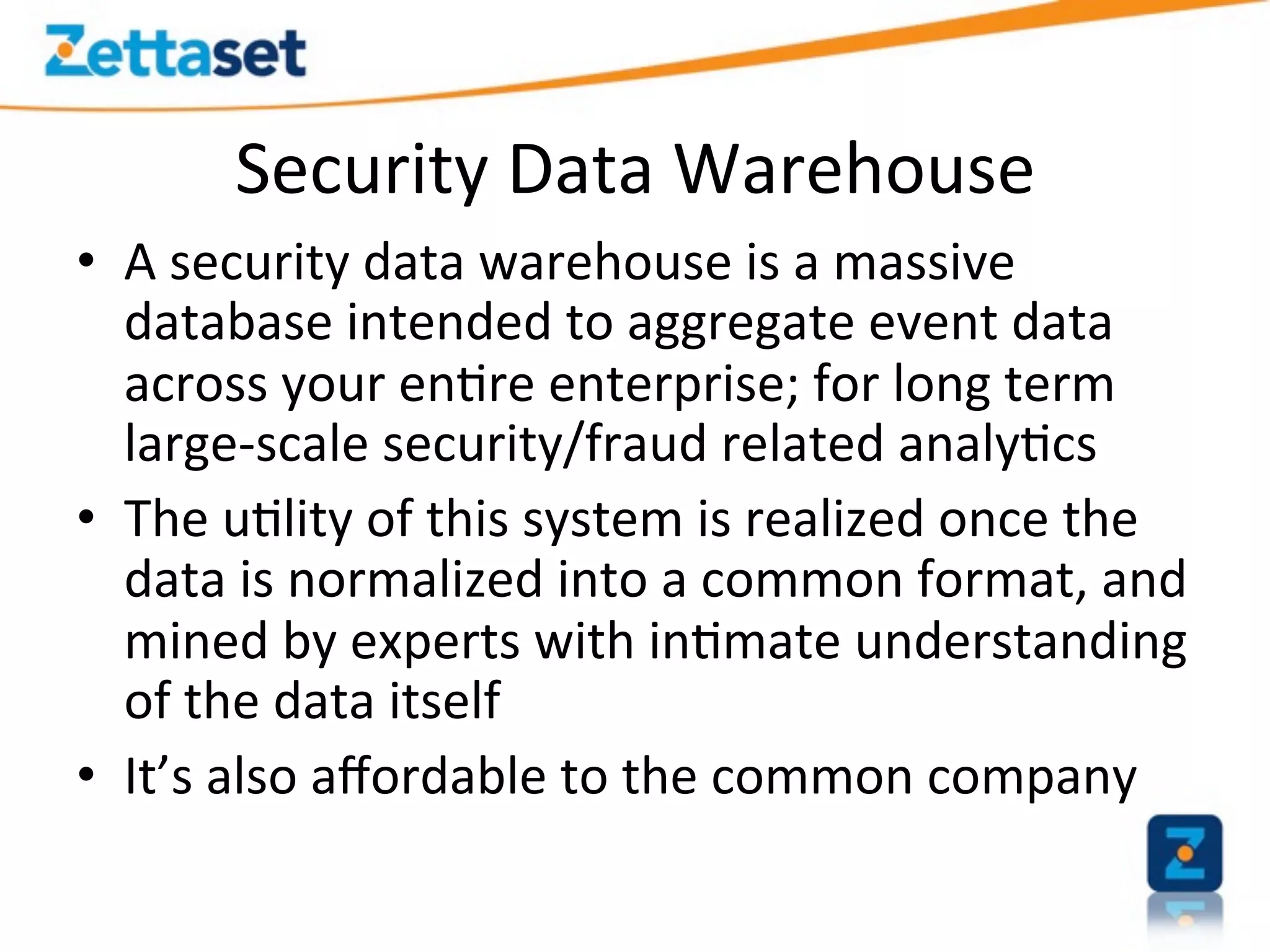 A Security Data Warehouse (SDW) is a massive database built using Hadoop and Hive that aggregates security and fraud-related event data from across an entire enterprise for long-term analytics. Zions Bank built an SDW to address limitations of their SIEM in dealing with large, unstructured datasets and to provide a common platform where security and fraud teams could collaborate by analyzing the complete historical data in one system. The SDW utilizes various Hadoop features for scalability, fault tolerance and handling different data types to support petabytes of stored data and thousands of daily analysis jobs.