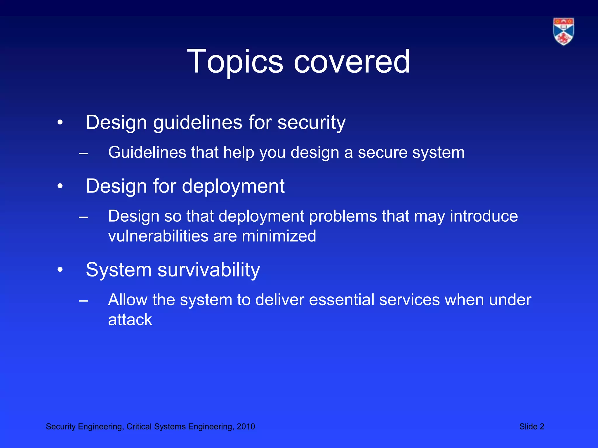 The document discusses security engineering design guidelines and system survivability. It covers: