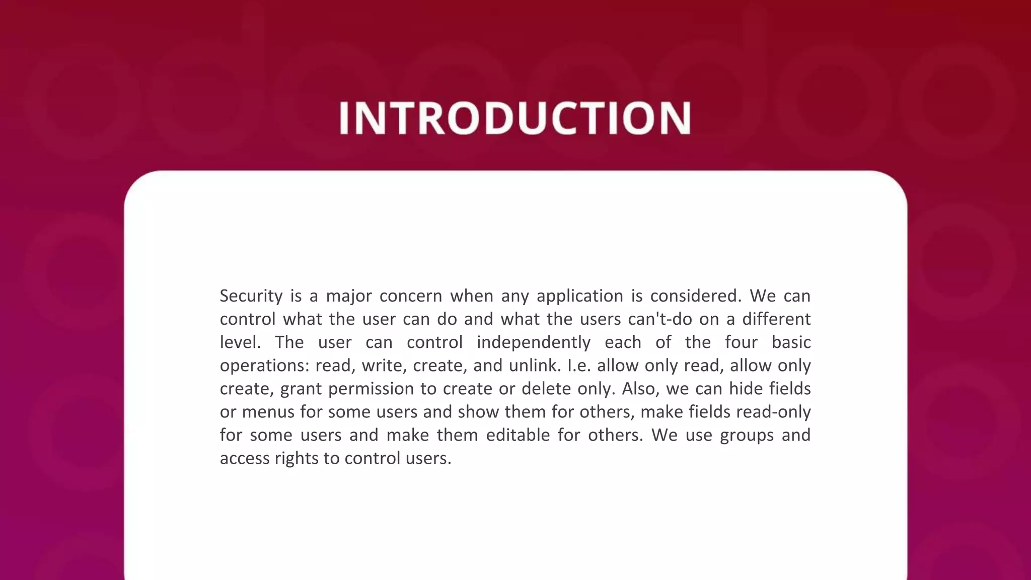 The document discusses the importance of security groups and access rights in Odoo 16, highlighting the controls over user actions such as read, write, create, and unlink. It explains how security groups aggregate access rights for users, restricting or permitting access to features based on group membership. Additionally, the document emphasizes the creation of security groups and access rights to ensure a secure database environment.