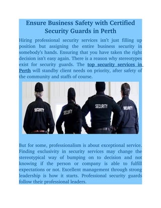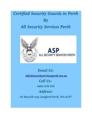 All Security Services Perth offers certified security guards to ensure business safety and address client security needs. Their services prioritize safety, emphasize communication with clients, and maintain thorough documentation of incidents to enhance professionalism. For more information, they can be contacted via email or phone, or through their website.