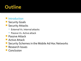 The document discusses security issues in mobile ad hoc networks (MANETs). It begins by introducing MANETs and noting their vulnerability to attacks due to lack of centralized authority. It then covers security goals, types of attacks (passive vs. active; internal vs. external), examples of passive attacks like eavesdropping and active attacks like jamming and wormholes. The document also discusses security schemes like intrusion detection and secure routing techniques. It concludes by identifying research issues around improving MANET security.
