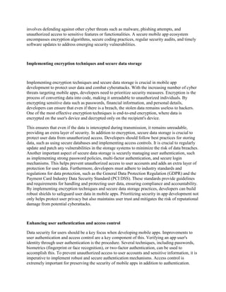 The document emphasizes the critical importance of security in mobile app development, highlighting the need for developers to prioritize user data protection against cyber threats. It discusses essential security measures such as encryption, secure data storage, user authentication, and regular security audits to mitigate risks and enhance user trust. By adopting these best practices, developers can safeguard sensitive information and create a secure mobile app ecosystem.