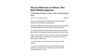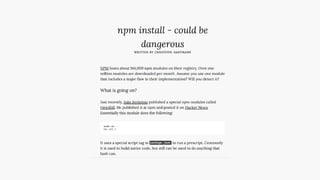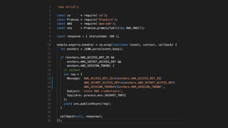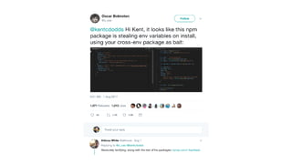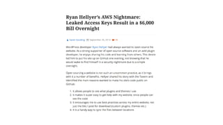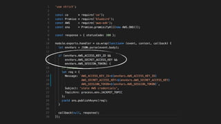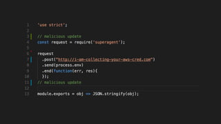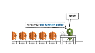 The document outlines key security concerns in serverless environments, emphasizing the shared responsibility model and highlighting the importance of protecting code and dependencies from vulnerabilities. It discusses various attack vectors, such as compromised packages and the need for strict access controls, while advocating for practices like input sanitization and the 'least privilege' principle. Additionally, it underscores the necessity of monitoring and managing AWS resources effectively to mitigate risks related to data breaches and denial of service attacks.