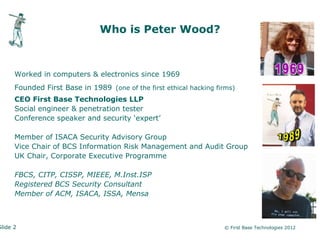The document, presented by Peter Wood, focuses on advanced persistent threats (APTs) and their implications for security intelligence. It discusses the evolution of sophisticated adversaries, case studies, entry points for attacks, and prevention strategies, highlighting the importance of understanding one's threat landscape. Key takeaways emphasize the need for tailored security policies, awareness of social engineering tactics, and the necessity for strong, complex passwords.