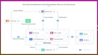 The document discusses the importance of e-commerce security, detailing various threats such as unauthorized access, hacking, and cyber fraud that affect both businesses and customers. It outlines essential security concepts such as authentication, encryption, confidentiality, and integrity necessary for safe online transactions. The document also describes different types of security threats and methods for protection, emphasizing the need for robust security measures to maintain customer trust and business viability in the e-commerce landscape.