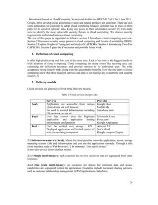 This document discusses security issues in cloud computing, specifically addressing distributed denial of service (DDoS) attacks and introducing a two-tier CAPTCHA method to improve authentication. It provides background on cloud computing models and challenges, including security concerns over data privacy and availability issues from DDoS attacks. The document proposes a new two-tier CAPTCHA method that generates an alphanumeric CAPTCHA code and image along with a related query to make it more difficult for bot programs to pass, improving security.