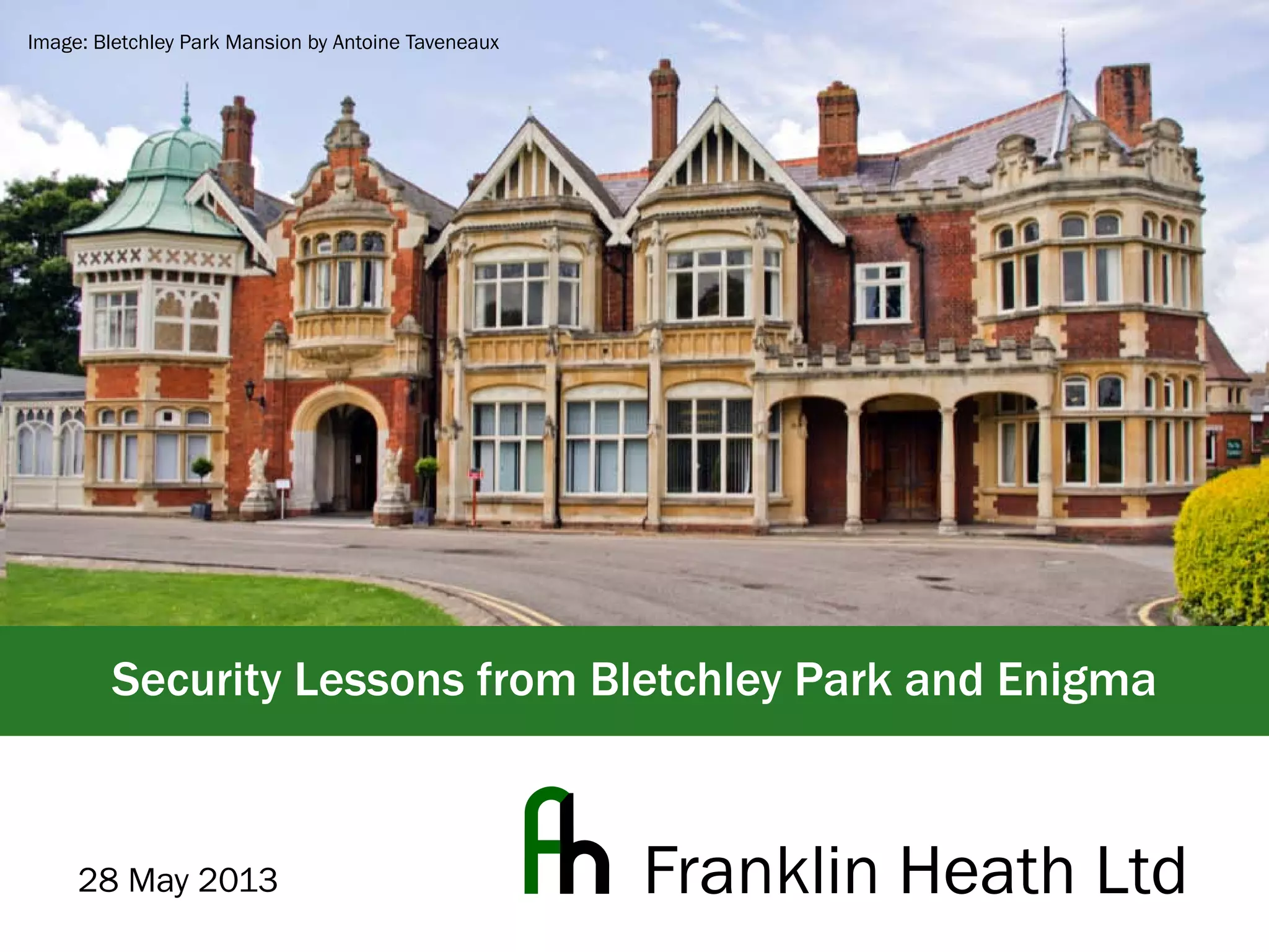 The document discusses the Enigma machine used by the German military during WWII and how Bletchley Park successfully exploited its flaws for codebreaking. It outlines five key lessons learned from this historical event: the subtle flaws in cryptosystems, the necessity of planning for key compromise, the tendency of users to choose weak passwords, the importance of selecting and trusting a good random number generator, and the need to not underestimate adversaries. The Enigma cipher, while sophisticated, was ultimately vulnerable due to weaknesses in key management and predictable user behavior.