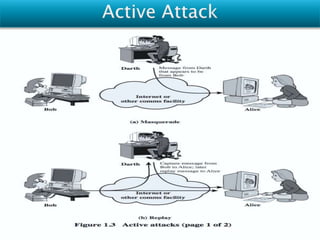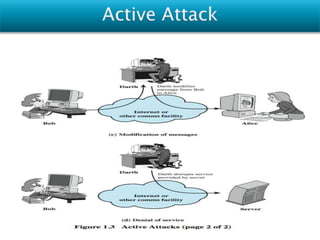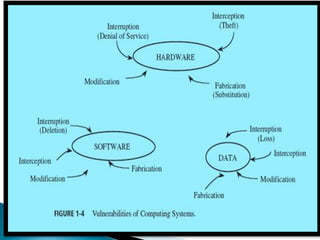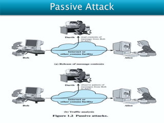 Vulnerabilities are weaknesses that attackers can exploit to gain unauthorized access to a network or its resources. Attacks are attempts to damage, access, or misuse assets without permission. Network security mechanisms detect, prevent, and recover from attacks using methods like routing control, traffic padding, encryption, access control, digital signatures, and ensuring data integrity.
