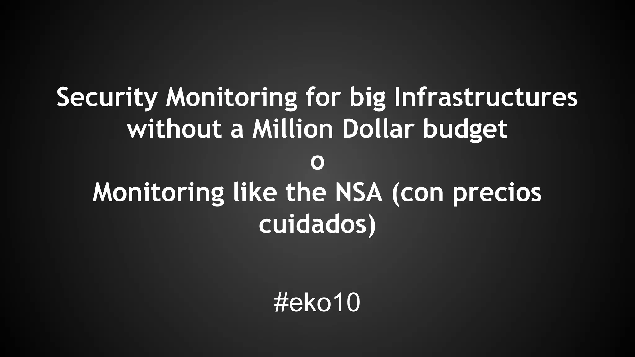 The document discusses effective security monitoring strategies for large infrastructures using open-source tools, specifically focusing on the ELK stack (Elasticsearch, Logstash, Kibana). It emphasizes the importance of comprehensive logging, incident response, and compliance in today’s security landscape, while also addressing the limitations of traditional monitoring systems. The presentation concludes with insights into implementing a scalable monitoring solution and potential future advancements in monitoring technologies.