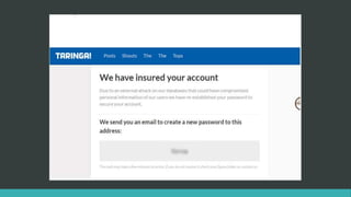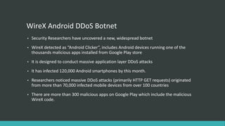 This document summarizes several recent security news stories. It reports on the discovery of the WireX Android botnet that has infected over 120,000 devices and is used to conduct DDoS attacks. It also mentions a data breach at Instagram that exposed users' contact info, the hacking of WikiLeaks' website by changing its DNS, the exposure of 630 million email addresses used by a spam bot, and the use of the CIA malware AngelFire to gain remote access on Windows devices. The document concludes by covering the Locky ransomware email scheme and a data breach at the social network Tiranga.