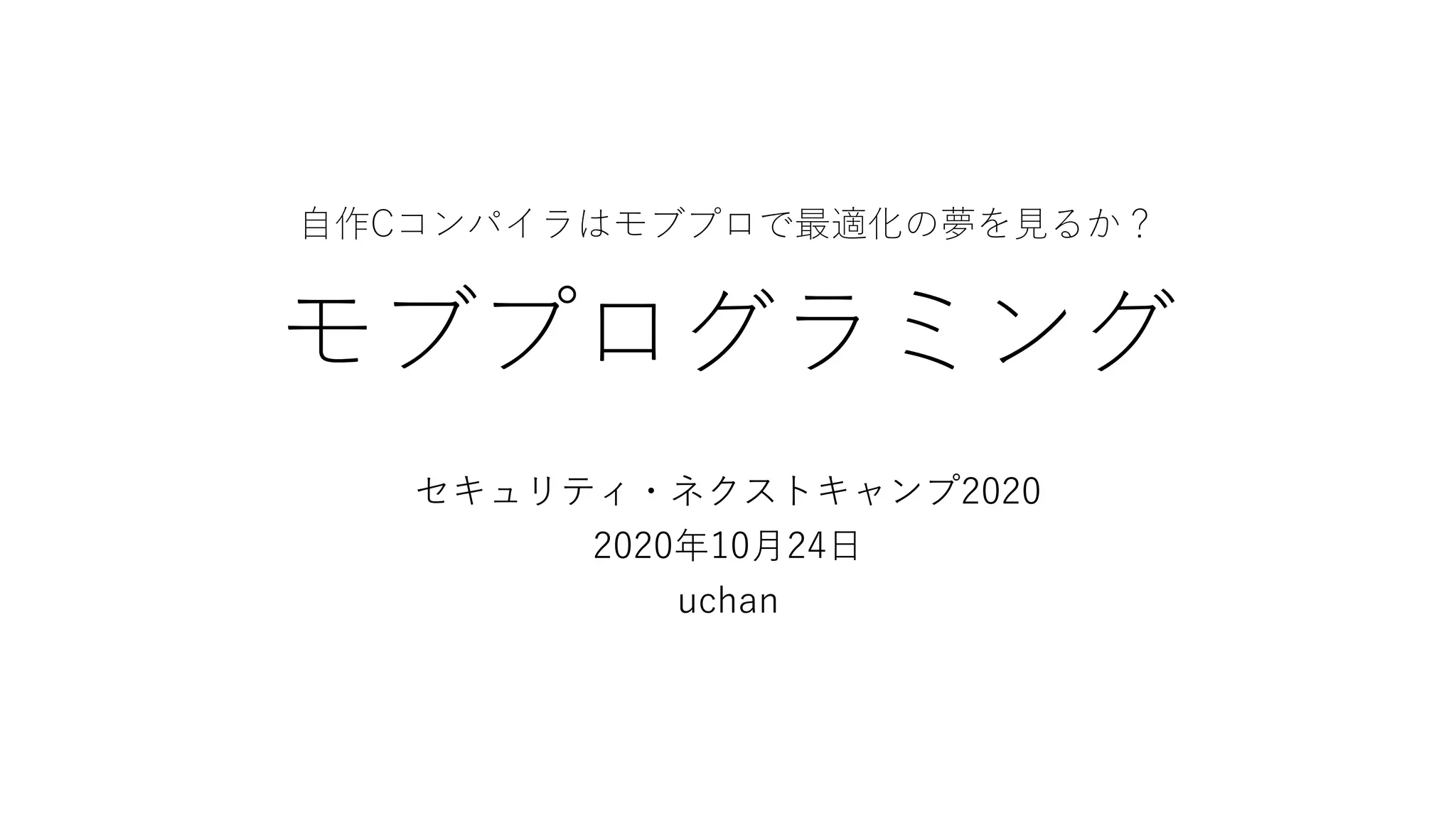 自作Cコンパイラはモブプロで最適化の夢を見るか? モブプログラミング セキュリティ・ネクストキャンプ2020 2020年10月24日 uchan