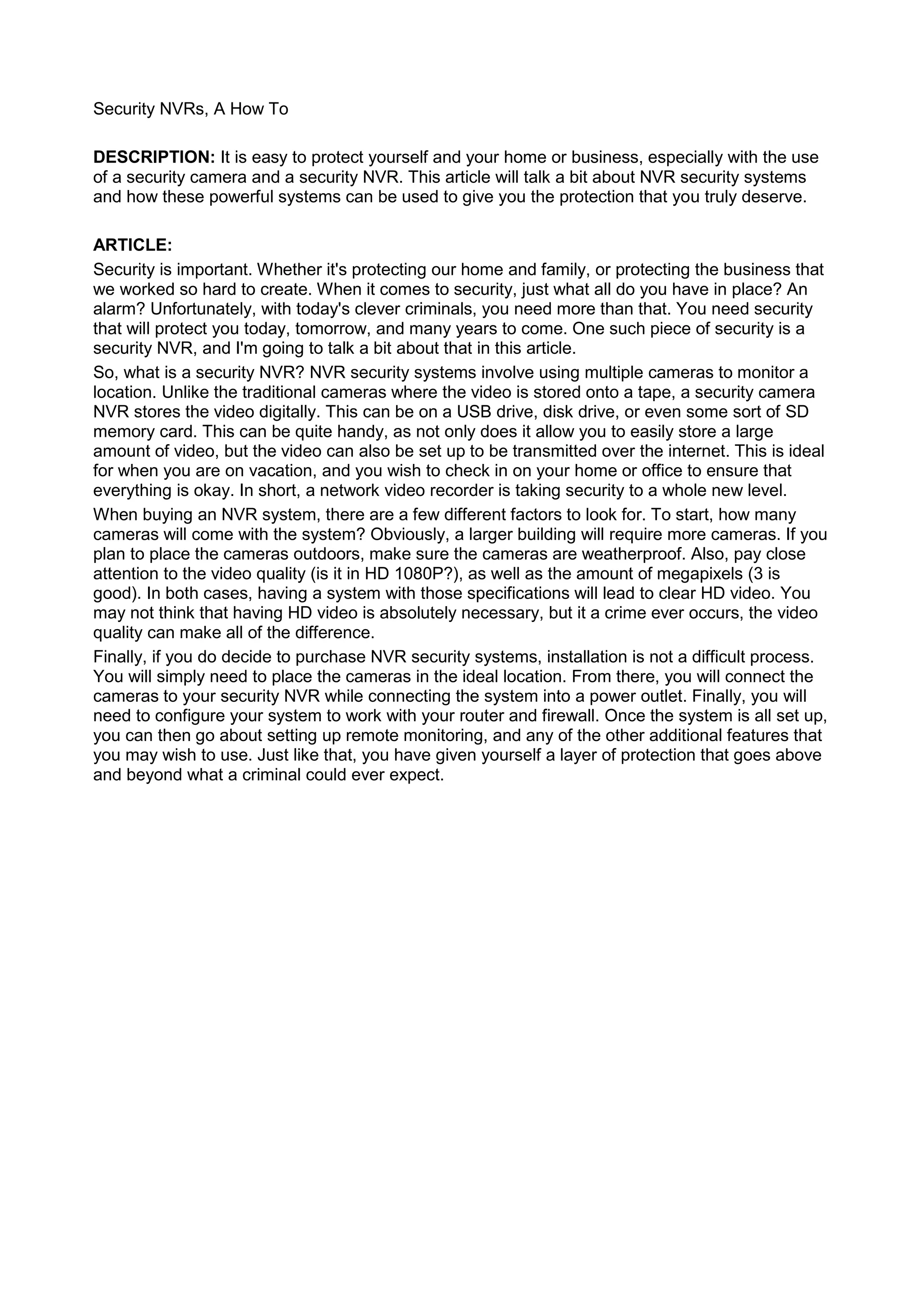 This article discusses security NVR systems and how they can protect homes and businesses. It explains that an NVR system involves using multiple cameras to digitally record and store video that can then be accessed over the internet. Key factors to consider when purchasing an NVR system include the number of cameras, video quality, and ensuring outdoor cameras are weatherproof. Installation is also described as straightforward, only requiring mounting cameras, connecting them to the NVR unit, and configuring the system to work with a router and firewall.