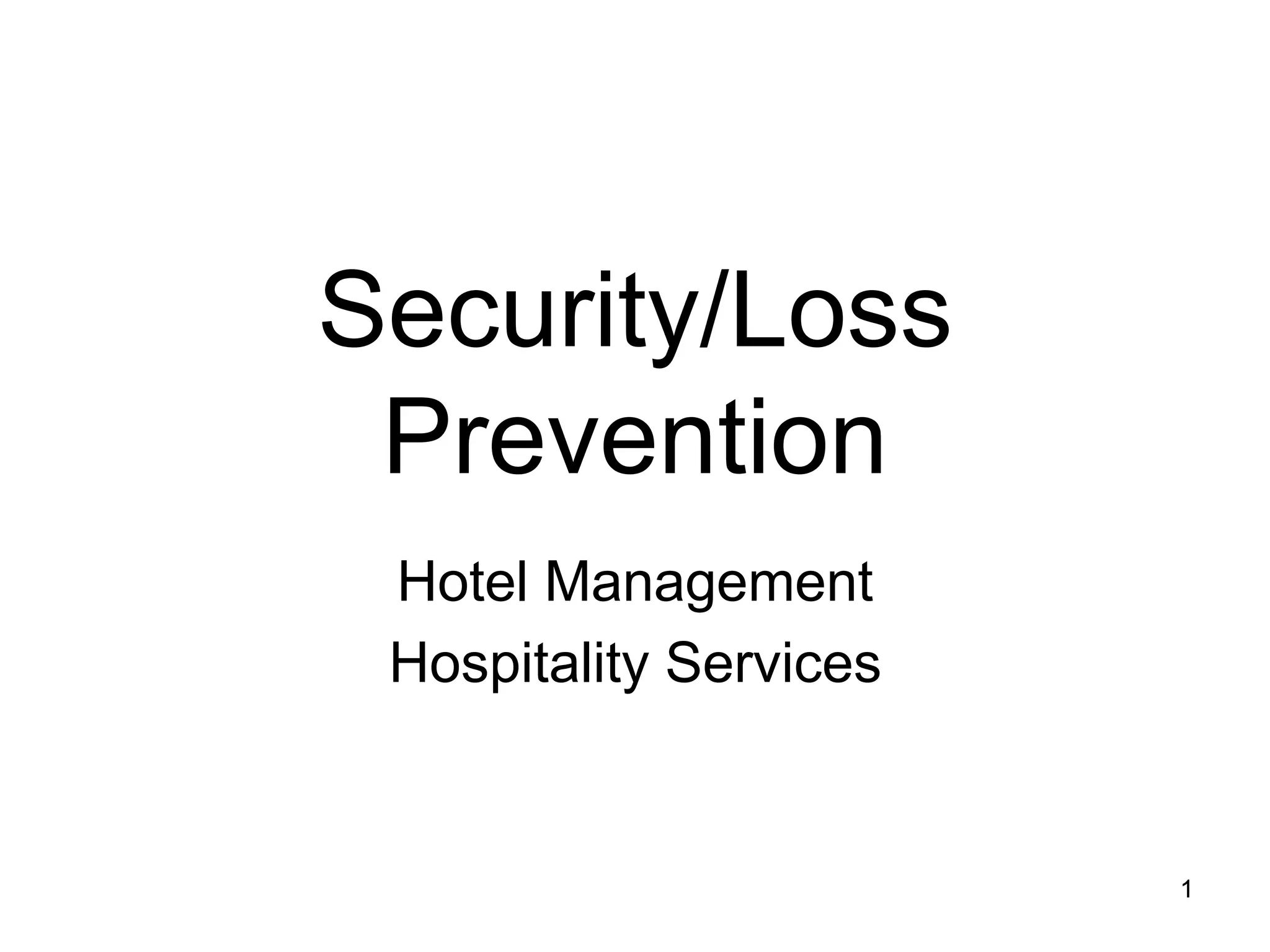 This document outlines the importance of security within the hospitality industry, highlighting various threats such as theft, natural disasters, and employee safety. It emphasizes prevention as a shared responsibility among all staff, detailing the roles of security officers, security policies, and emergency preparedness. Additionally, it discusses liability concerns, insurance coverage, and the significance of proper key control systems in maintaining security and reducing risks.