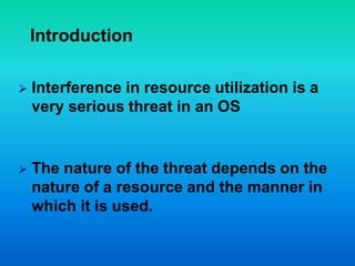Operating systems use protection and security techniques to counter threats to information. Protection involves guarding a user's data and programs from interference by other authorized users, while security guards against interference from unauthorized external entities. There are two facets to protection: secrecy, where only authorized users can access information, and privacy, where information is only used for its intended purpose. Security and protection policies are enforced through mechanisms like access control lists and authentication. The goals of security and protection are secrecy, privacy, authenticity, and integrity of information.