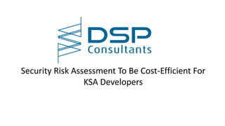 The document discusses the importance of security risk assessments for developers in Saudi Arabia, focusing on cost-effective strategies to enhance security amidst rapid infrastructure developments. It outlines how consultants can help organizations identify and prioritize risks, optimize resources, ensure regulatory compliance, reduce insurance premiums, and prevent incidents, ultimately leading to cost savings. DSP Consultants is highlighted as a resource for achieving efficient security solutions tailored to clients' needs.