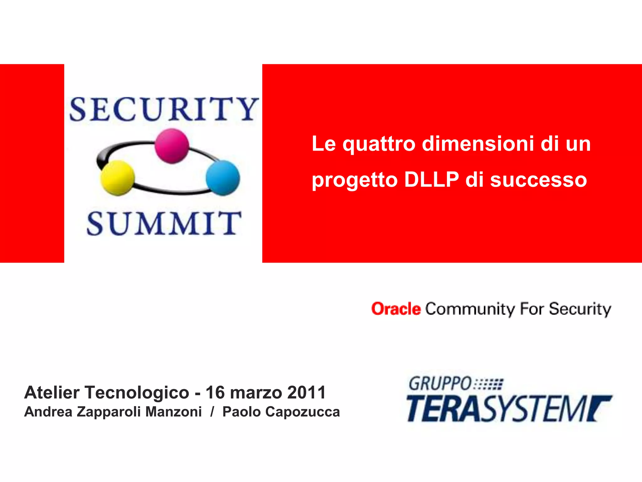 Il documento analizza il tasso di successo dei progetti di Data Loss Prevention (DLP), evidenziando che è solo del 32% a causa di fattori come mancanza di supporto, aspettative irrealistiche e scarsa engagement degli stakeholder. Viene proposto un modello di successo basato su quattro dimensioni: organizzativa, gestionale-formativa, legale-amministrativa e tecnologica, accompagnato da una serie di componenti sistemici trasversali. È essenziale un approccio multidisciplinare per garantire l'efficacia e la compliance continua del sistema DLP.
