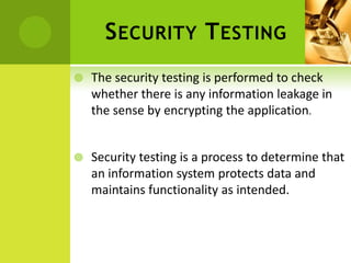 The document outlines the significance and methodology of security testing for web and mobile applications, emphasizing key concepts such as authentication, confidentiality, and integrity. It details various types of security testing, including security auditing and penetration testing, alongside common security threats like SQL injection and cross-site scripting. The importance of using specific security testing tools and the commitment to keeping systems secure is also highlighted.