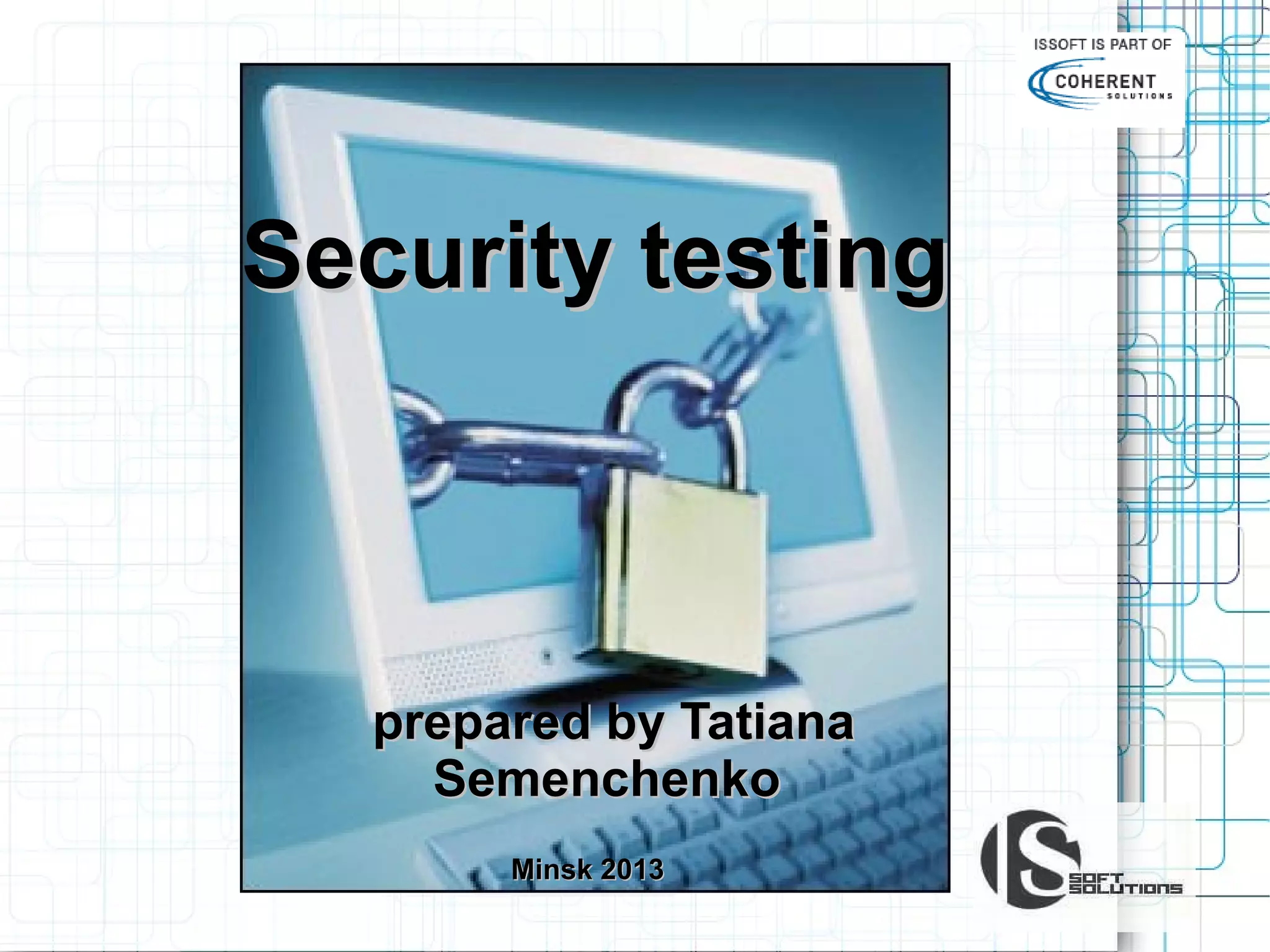 This document discusses the importance of security testing. It defines key security concepts like confidentiality, integrity, and availability. It describes common security testing methods like vulnerability scanning and penetration testing. It also provides examples of specific vulnerabilities like SQL injection, cross-site scripting, and social engineering attacks. The document seeks to demonstrate why organizations should invest in security testing now rather than just responding to attacks after they occur.