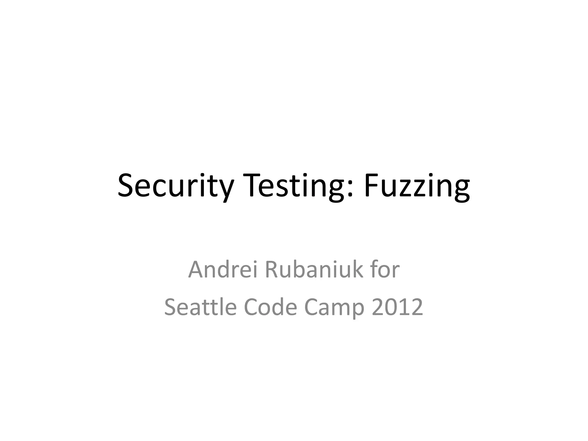 The document discusses security testing through fuzzing, a technique that involves providing malformed inputs to software to uncover exceptions and vulnerabilities. It highlights the effectiveness of fuzzing in identifying security bugs, its simplicity, and low cost of implementation, including a demonstration of a basic fuzzing tool called Minifuzz. The presentation emphasizes that while fuzzing is useful, it should supplement other testing methods rather than replace them.