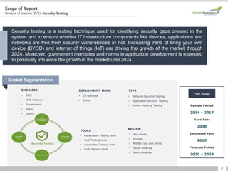 The document presents a forecast and analysis of the global security testing market from 2014 to 2024, focusing on the growth driven by trends such as BYOD and IoT. It outlines various types of security testing, market segmentation by region, tools, and end users, and examines market size and share forecasts. Additionally, the report includes insights on market dynamics, competitive landscape, and research methodology used to gather data.